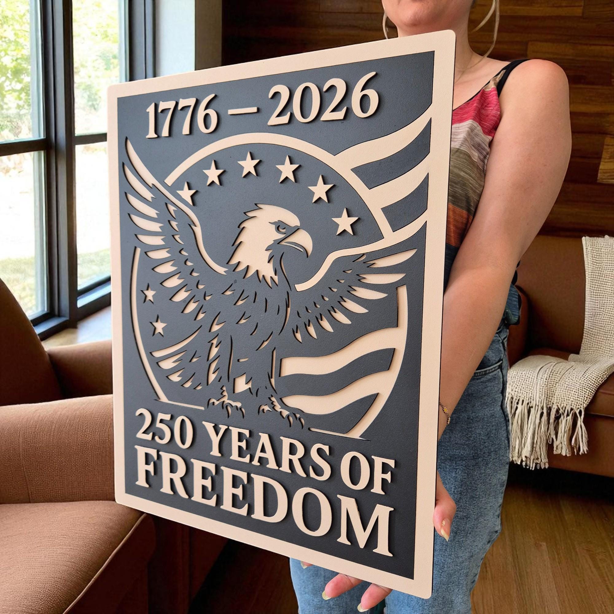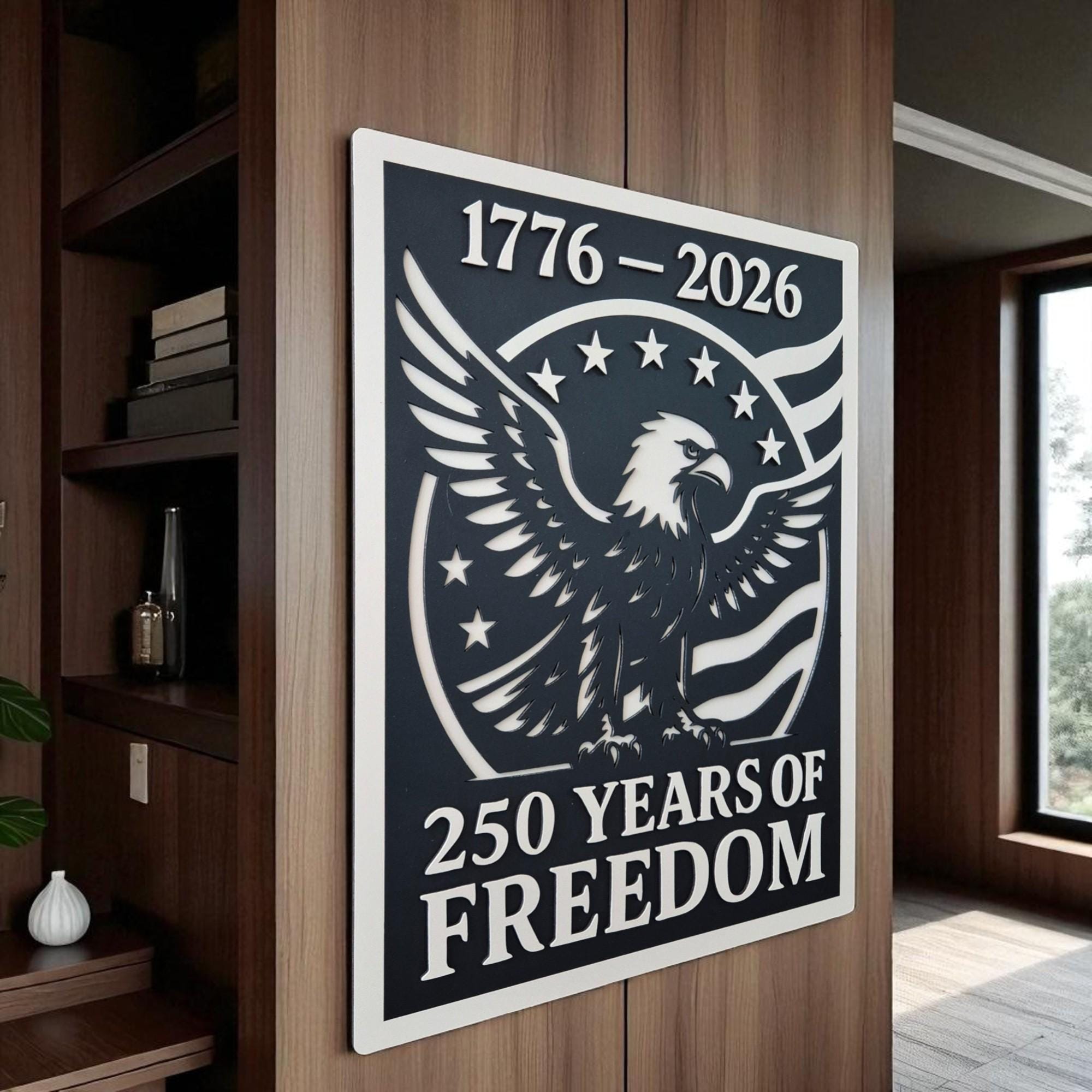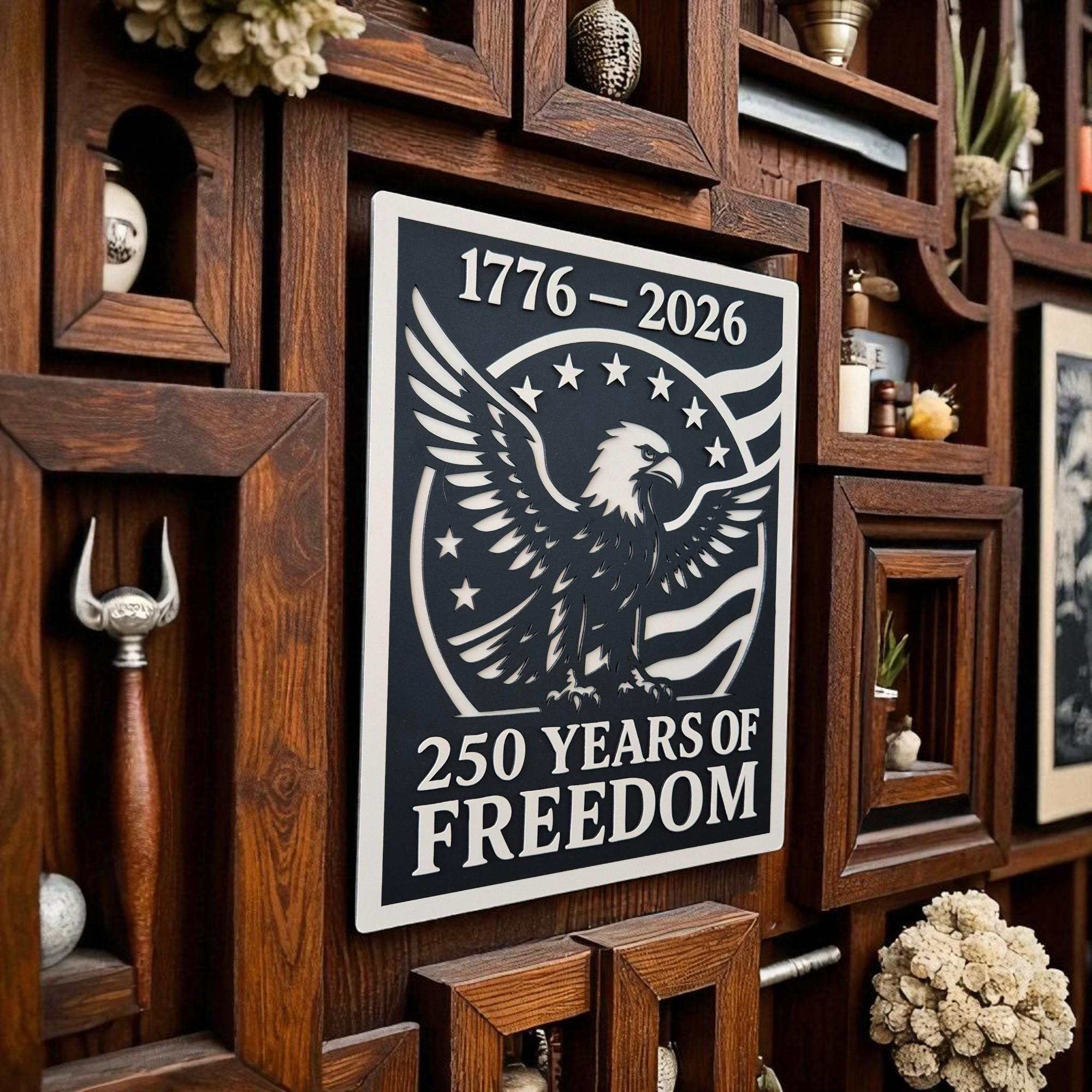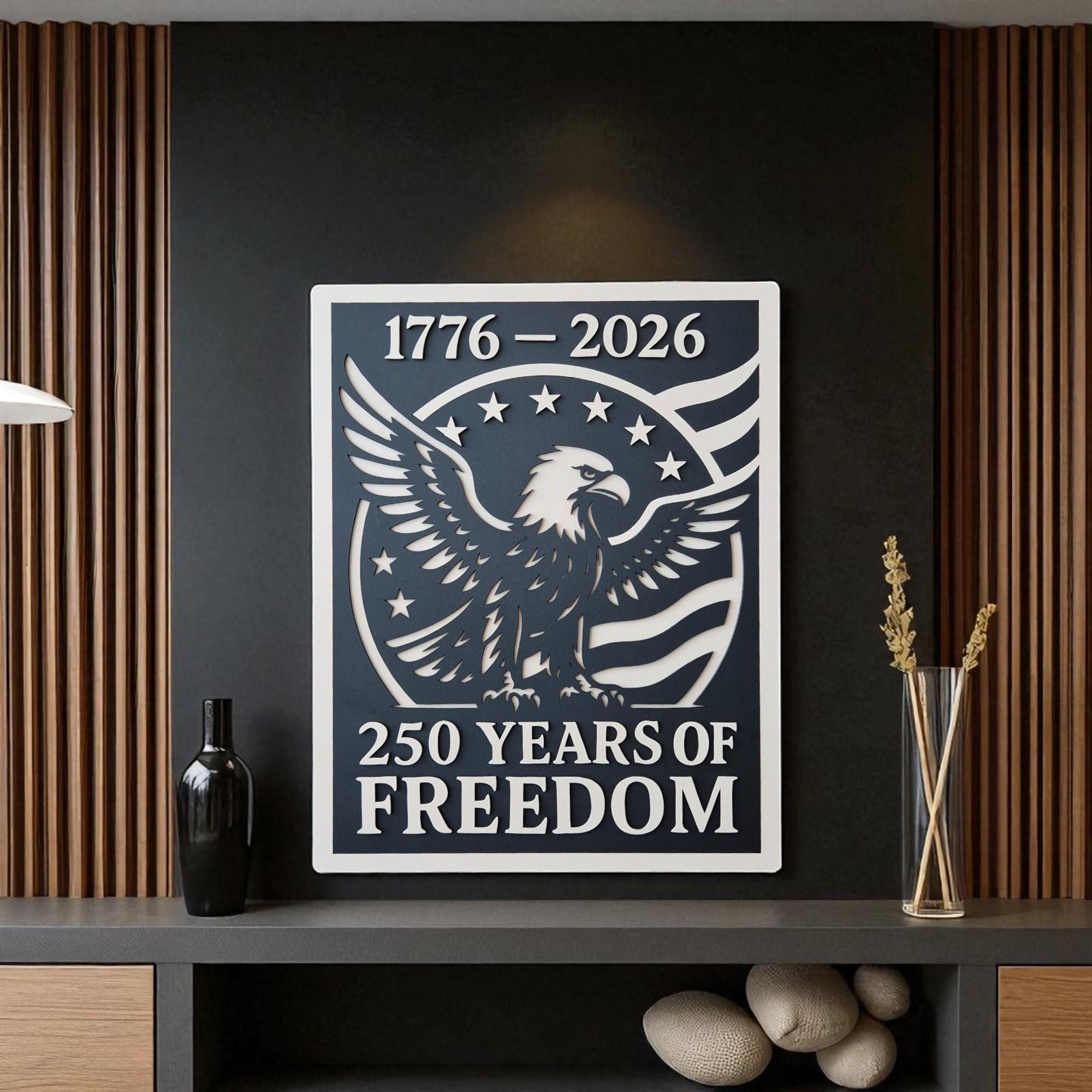 Celebrate 250 years of American independence with this stunning handcrafted wooden wall art. Featuring the iconic stars and stripes, this 3D layered design commemorates the journey from 1776 to 2026 in a bold and timeless style. A perfect piece for veterans, patriots, or anyone who holds American freedom close to heart.
