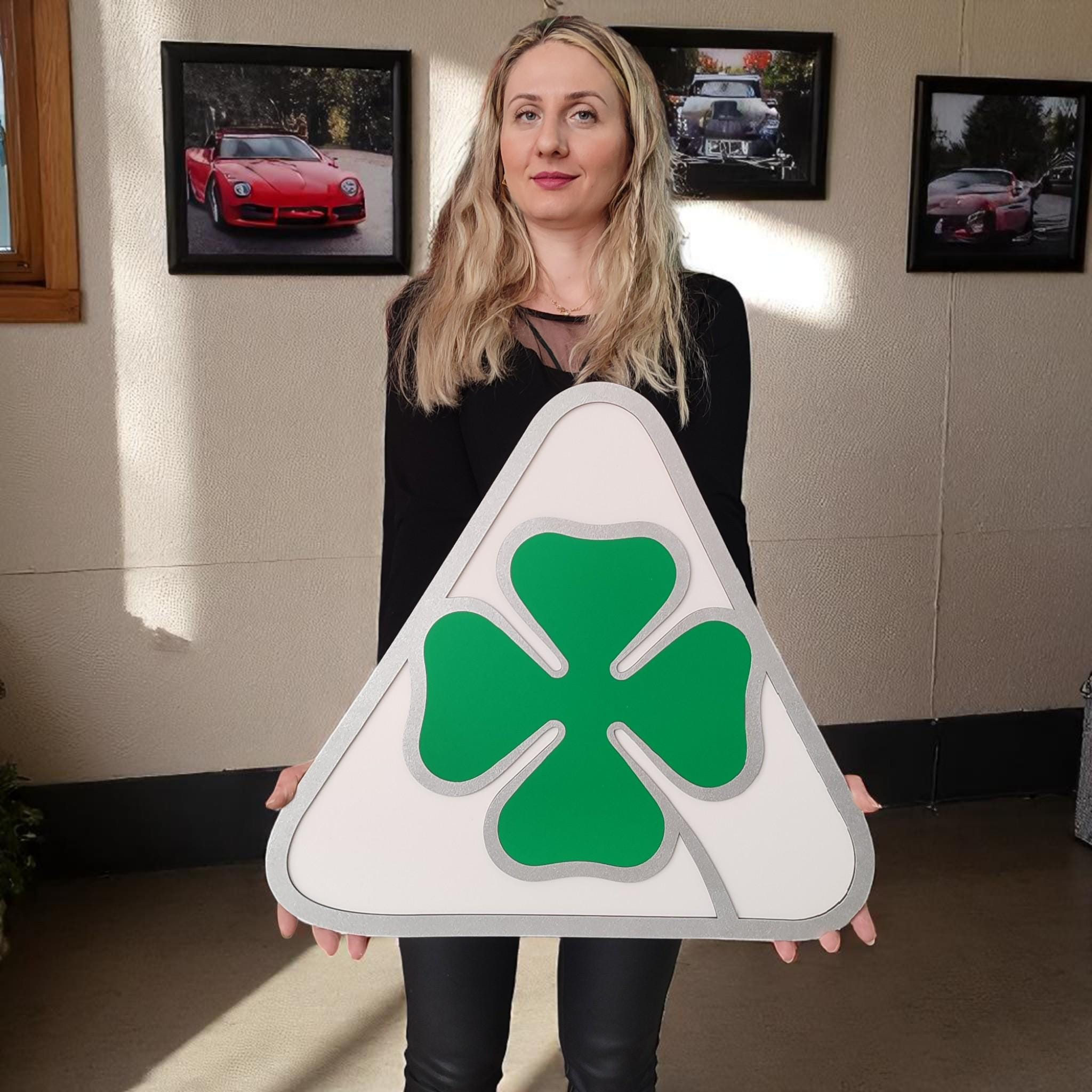 Celebrate racing heritage and Italian performance with this handcrafted Alfa Romeo Quadrifoglio wooden wall art. Featuring the iconic green four-leaf clover emblem, this unique piece is perfect for passionate Alfa drivers, collectors, and fans of classic European motorsport.