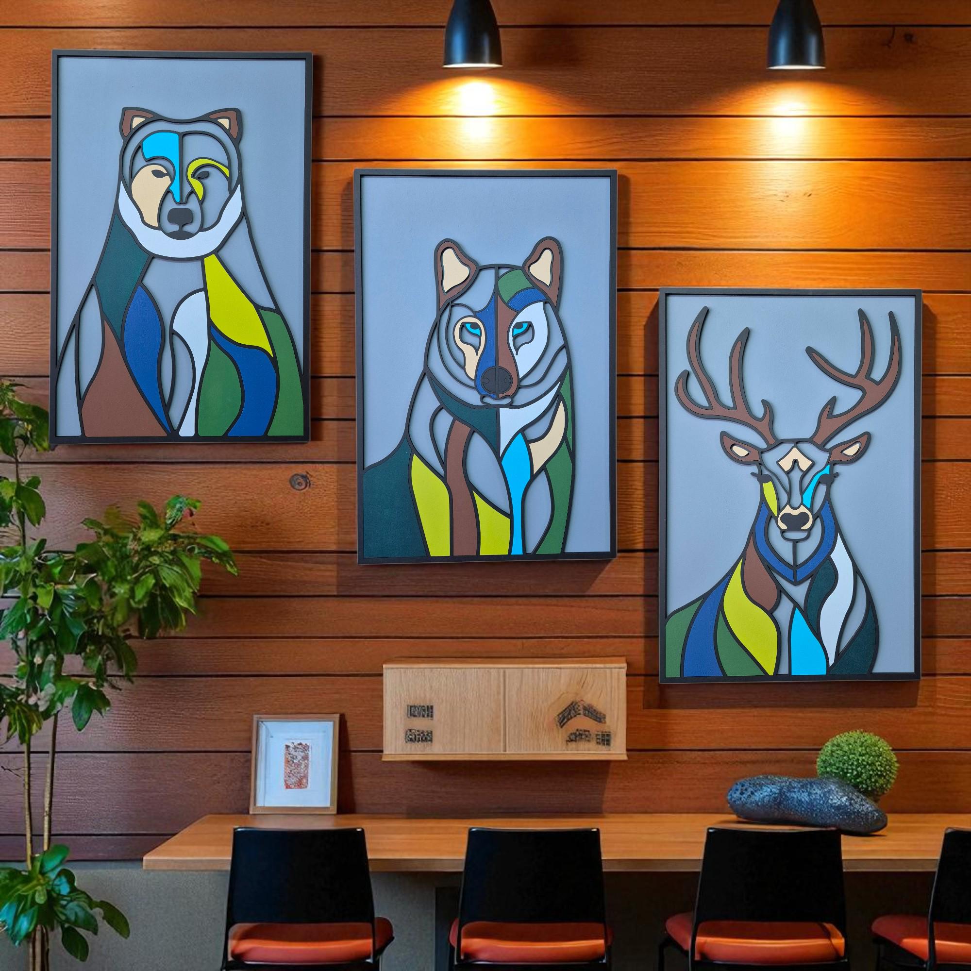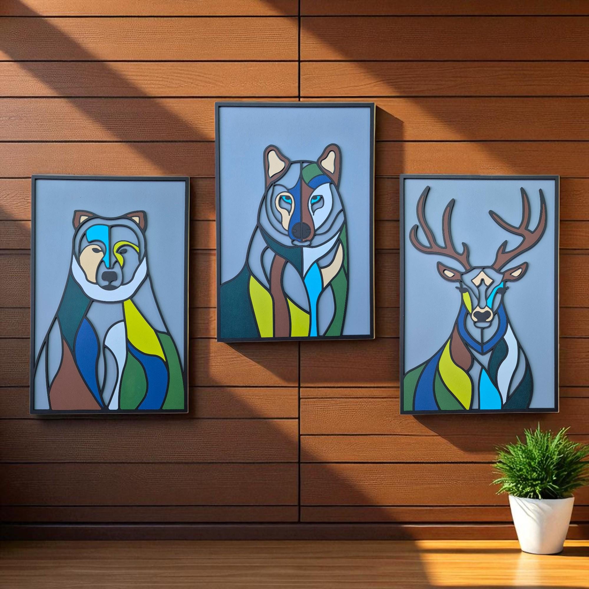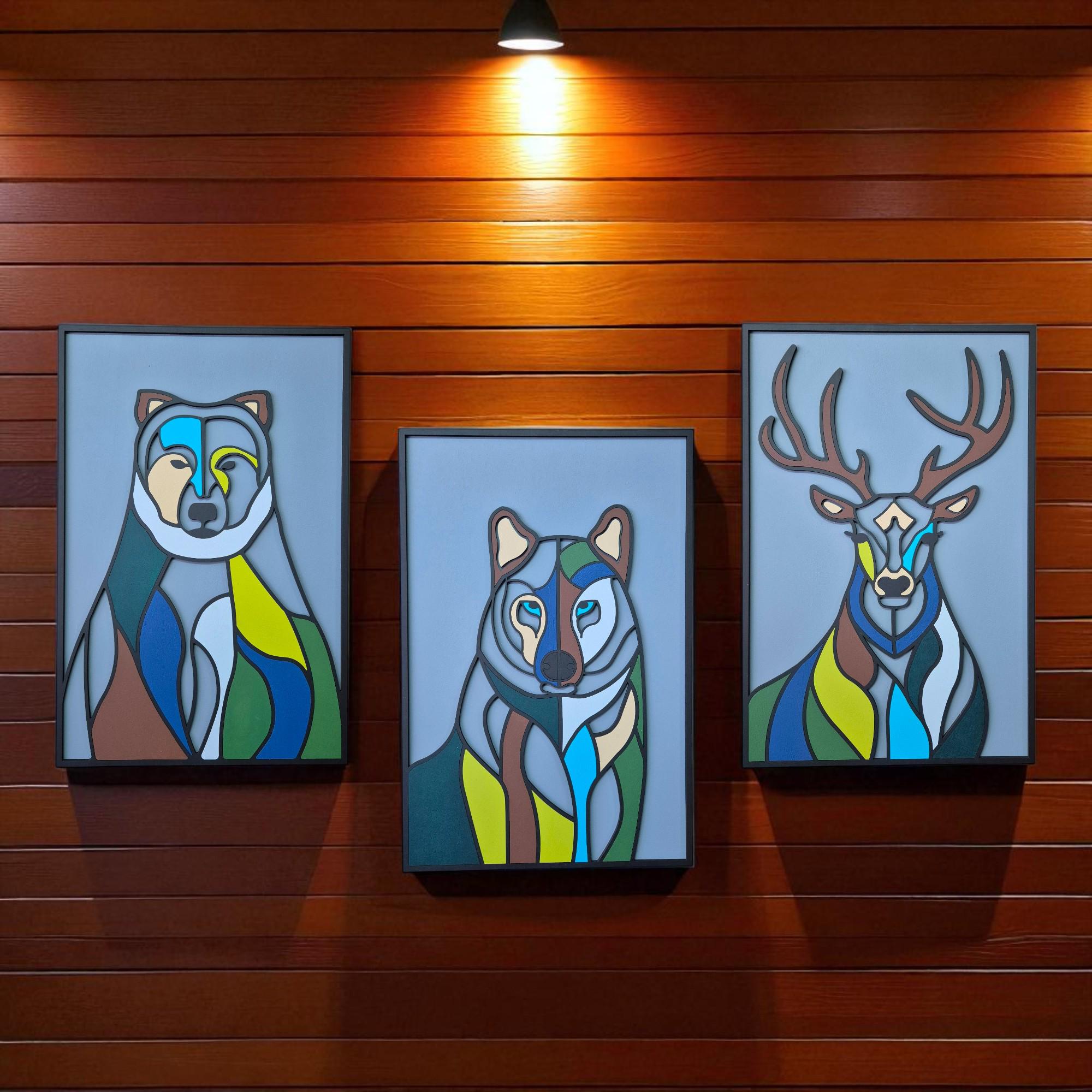 6. Set of 3 Panels – Includes wolf, deer, and bear for a complete wall art ensemble