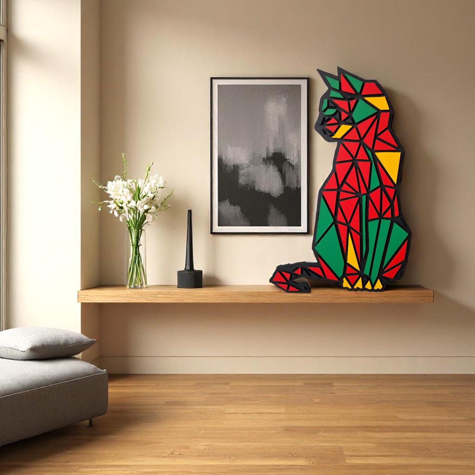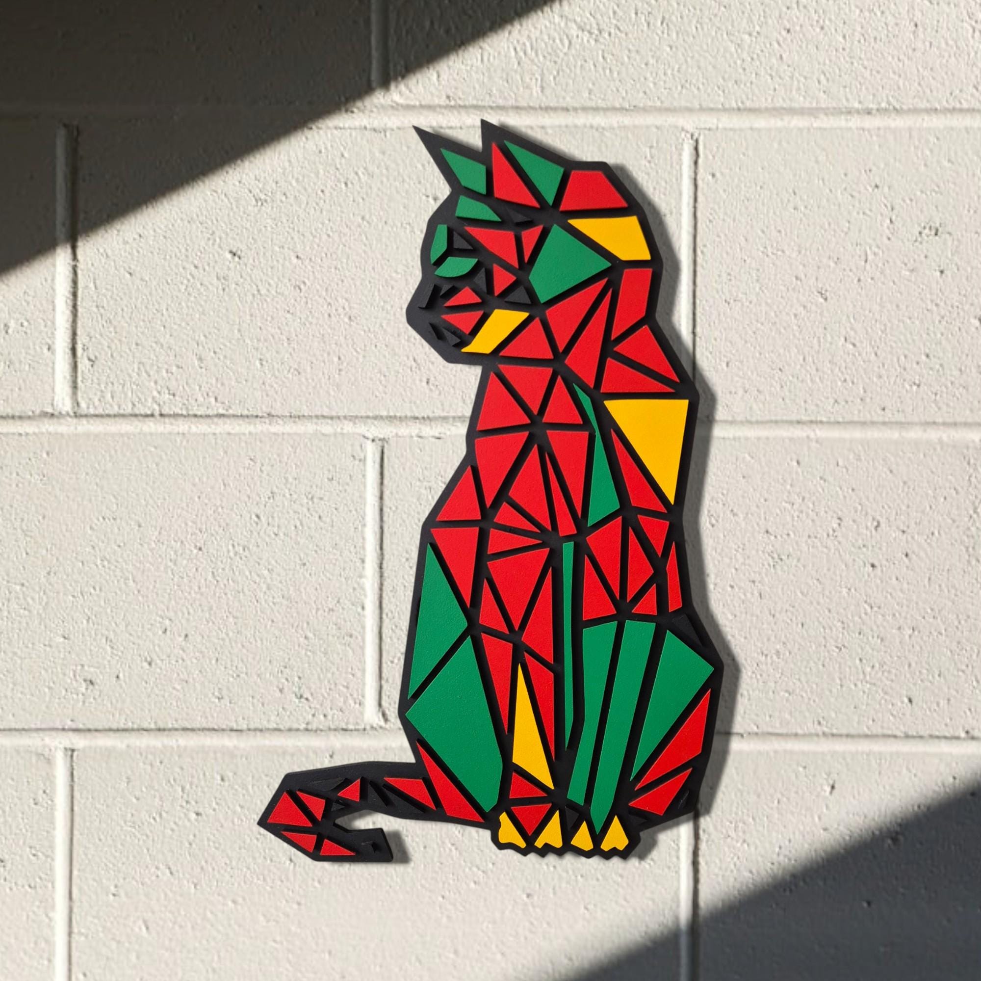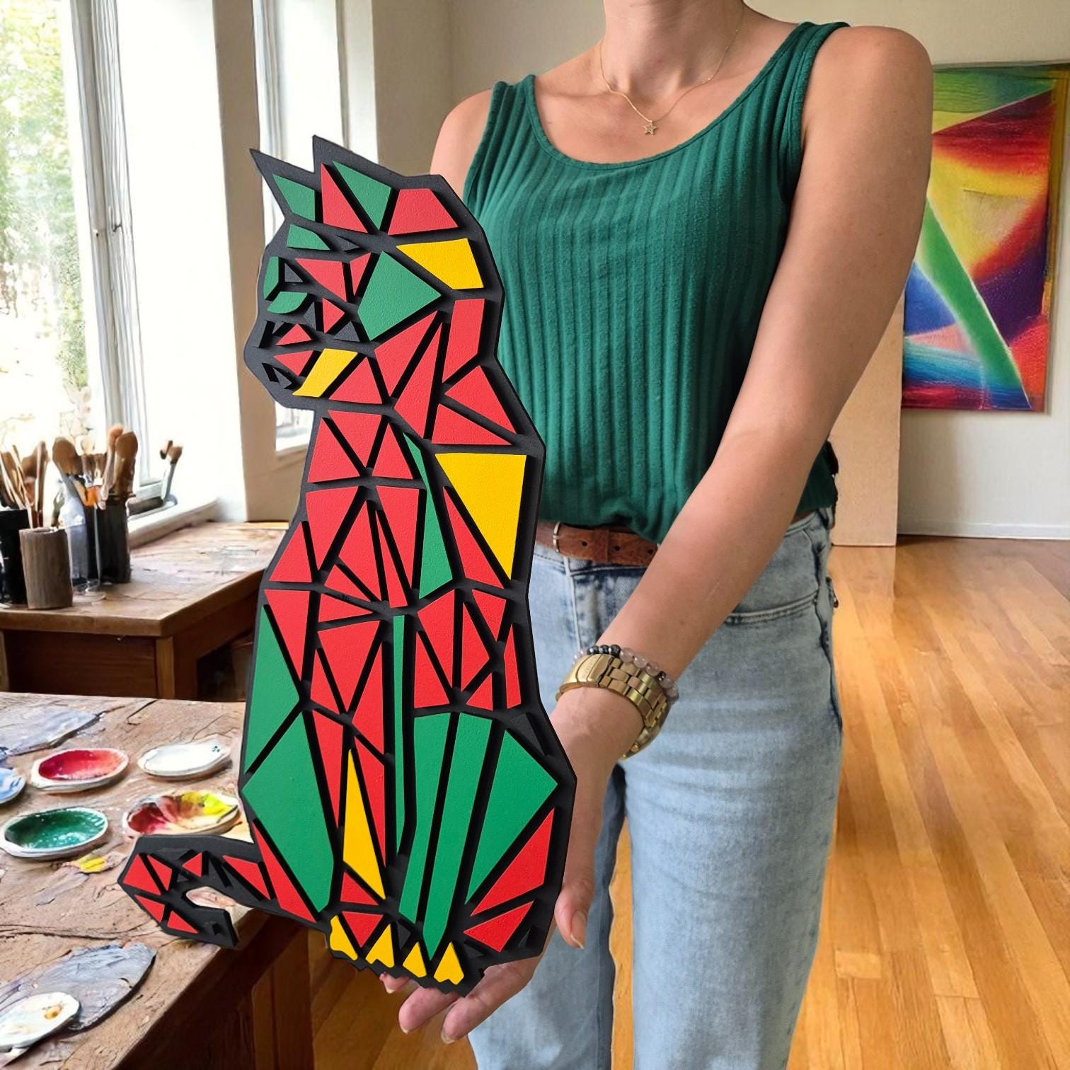 Geometric Cat Wall Art: Hand-Painted Wooden Decor