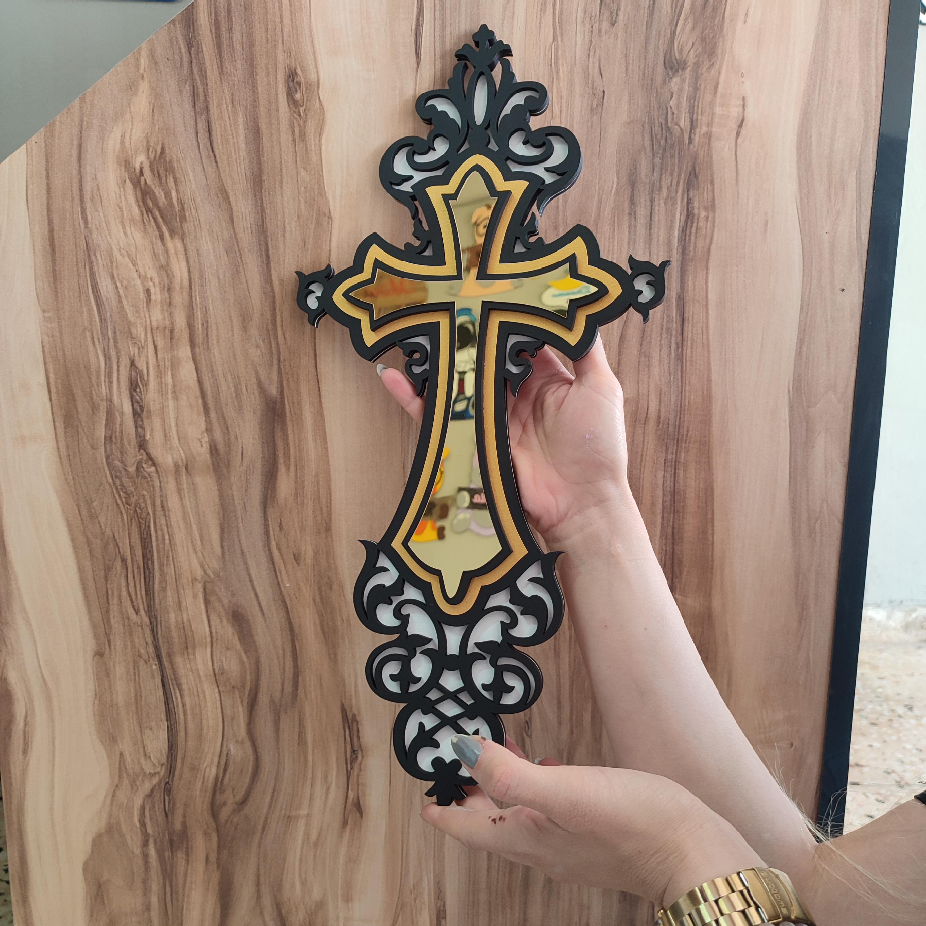 Elevate your sacred space with this handcrafted Gold Cross Wood and Acrylic Mirror Art, blending contemporary elegance with spiritual symbolism. The shimmering gold cross against warm wood creates a striking contrast, while the reflective acrylic adds depth and light to your decor.