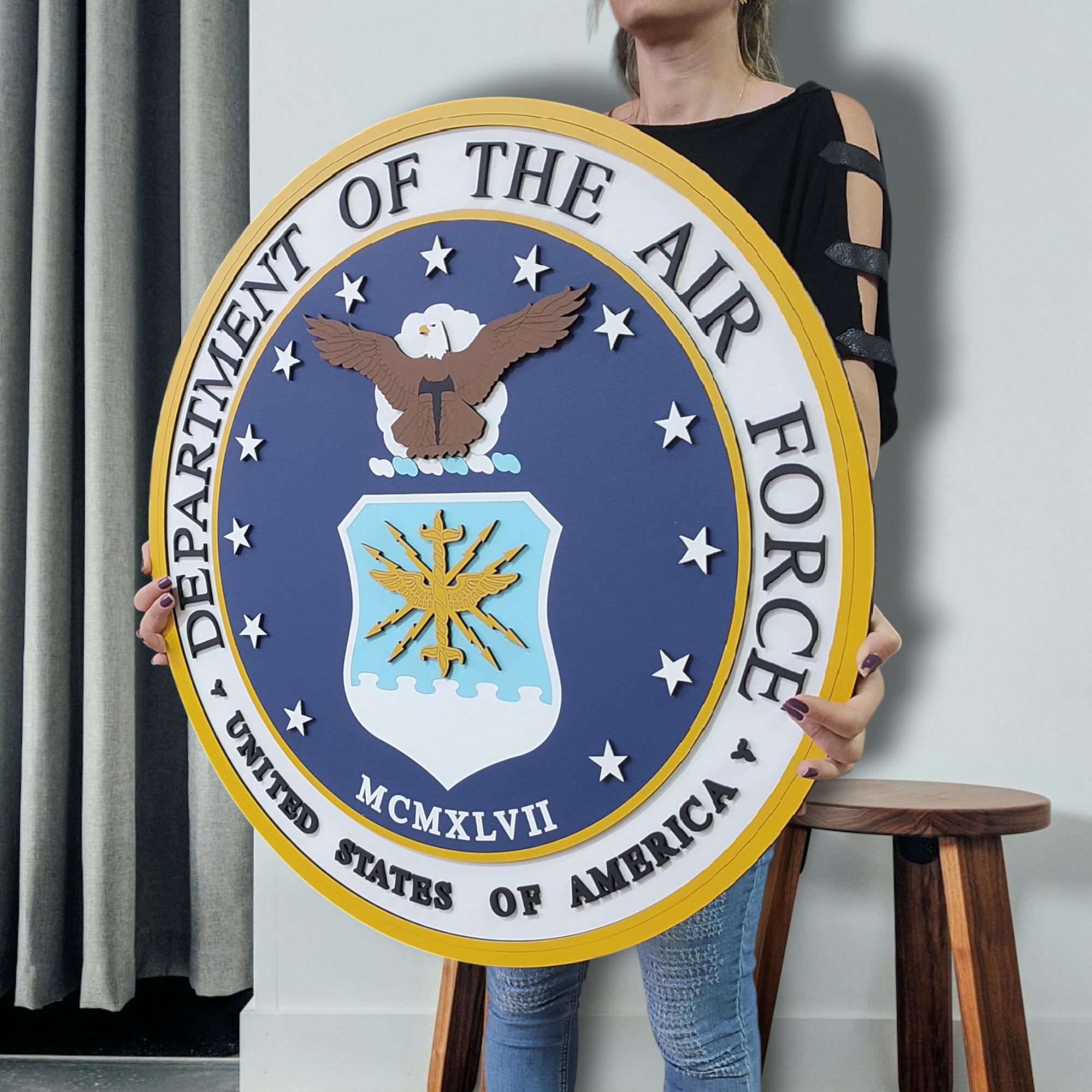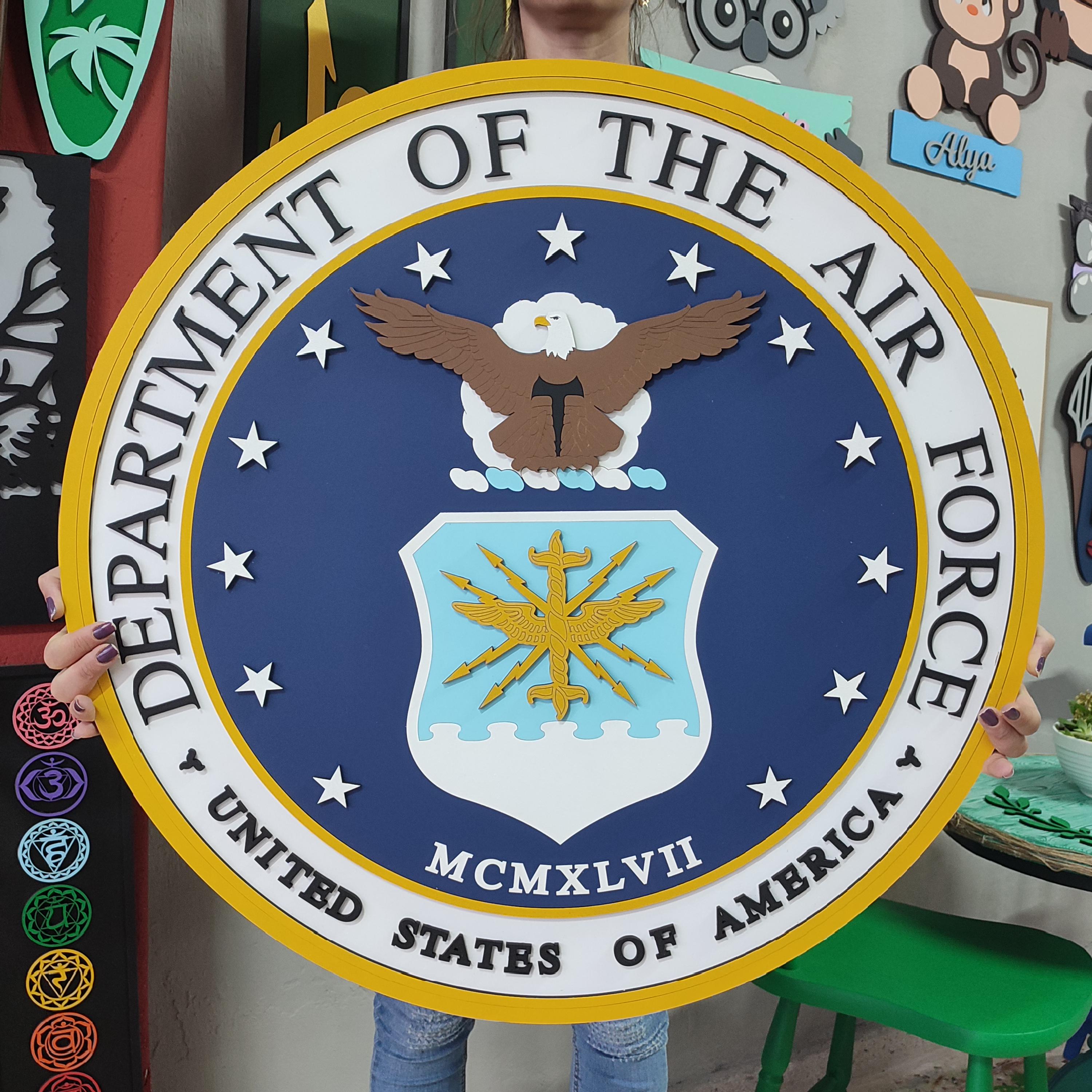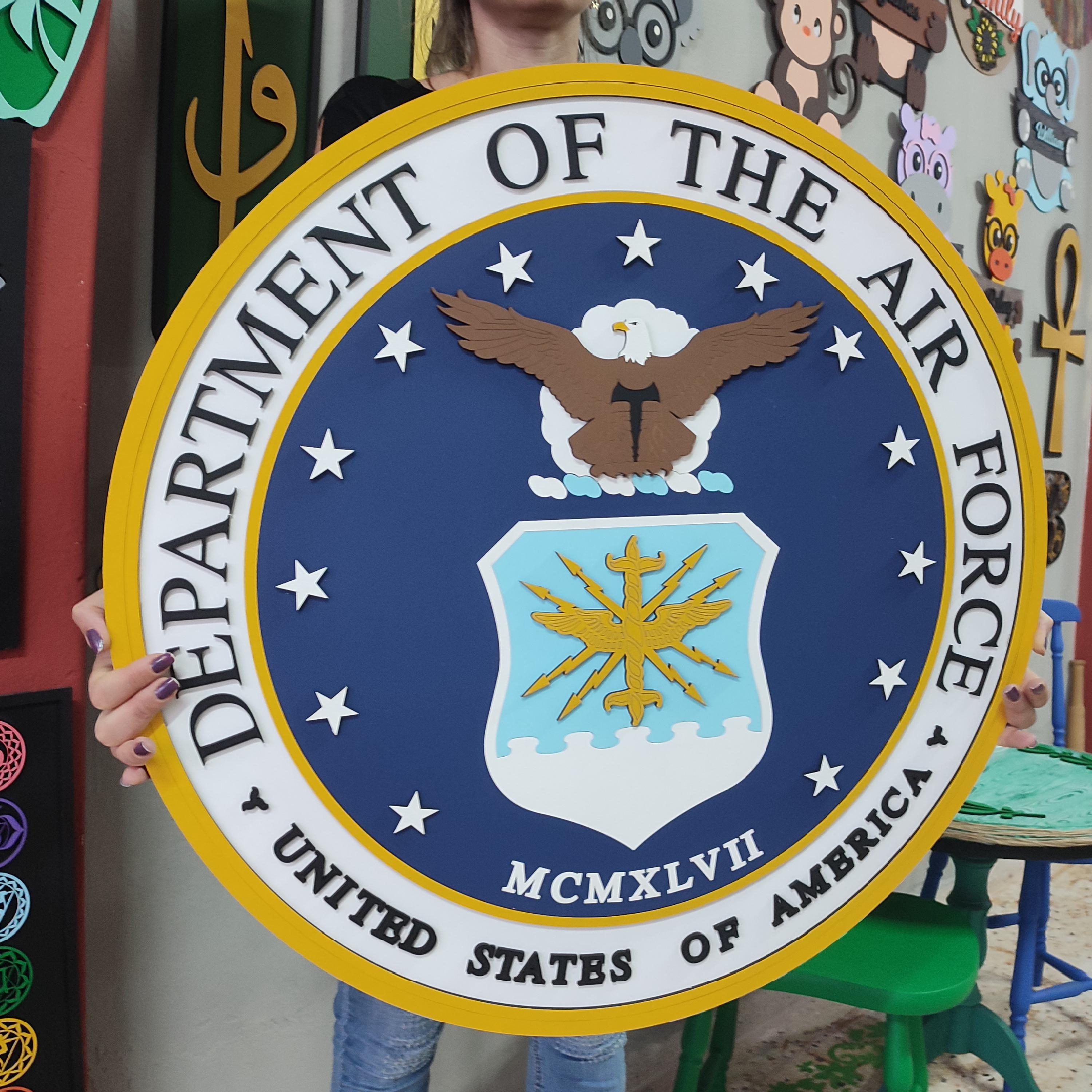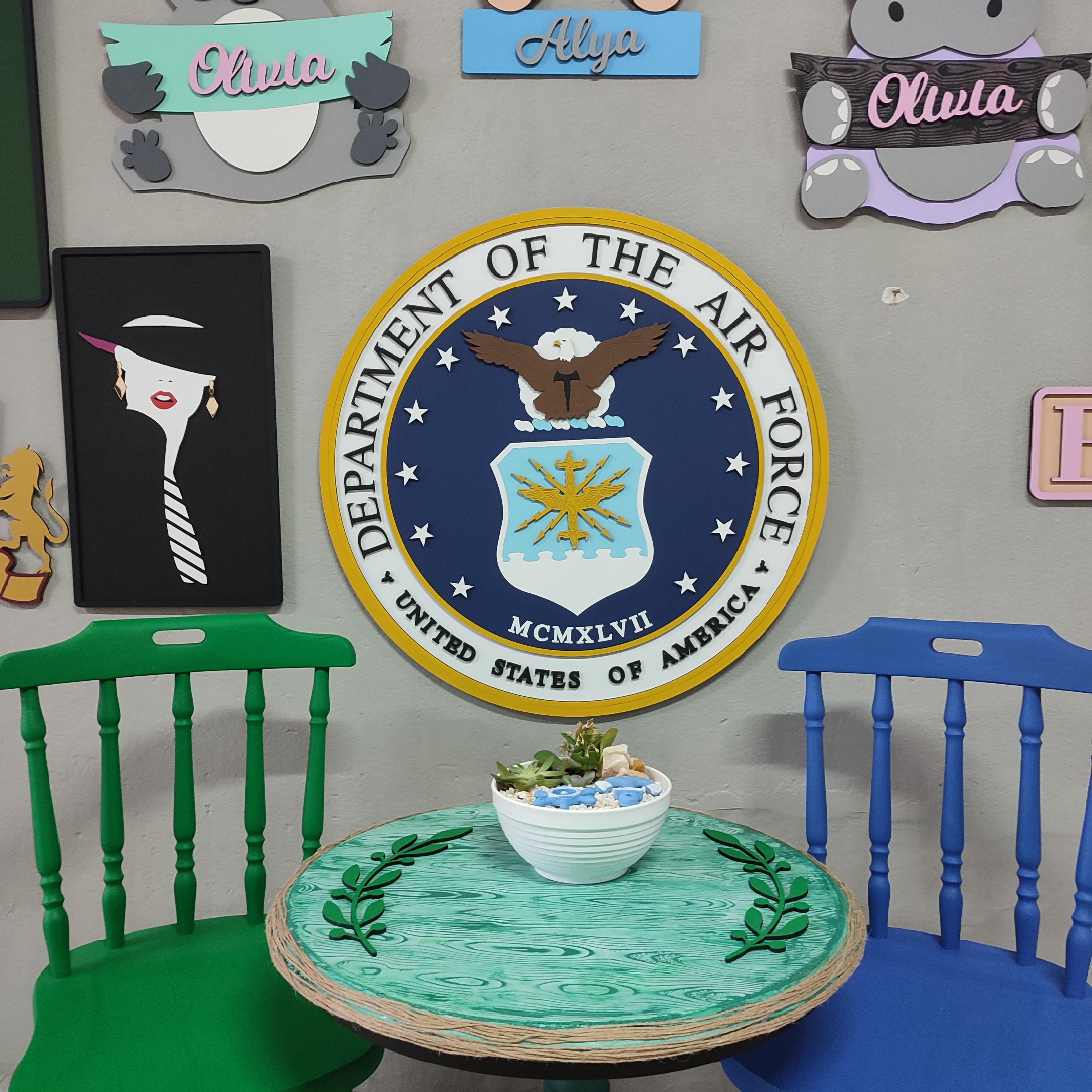 Show your pride and honor for the U.S. Air Force with this handcrafted USAF Wooden Emblem Wall Art. Featuring the official Department of the Air Force seal, this piece is a powerful tribute to military service and makes a bold patriotic statement in any space—whether at home, in the office, or in a veteran's corner.