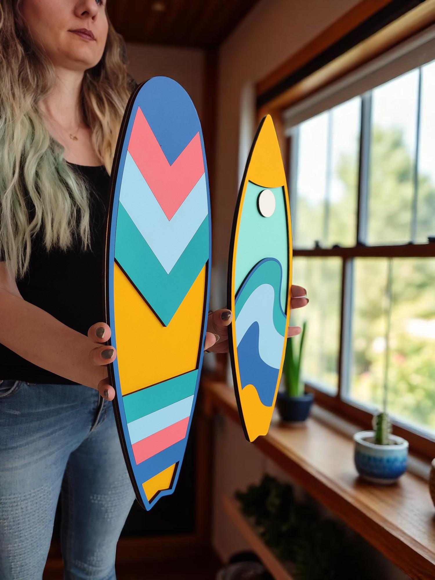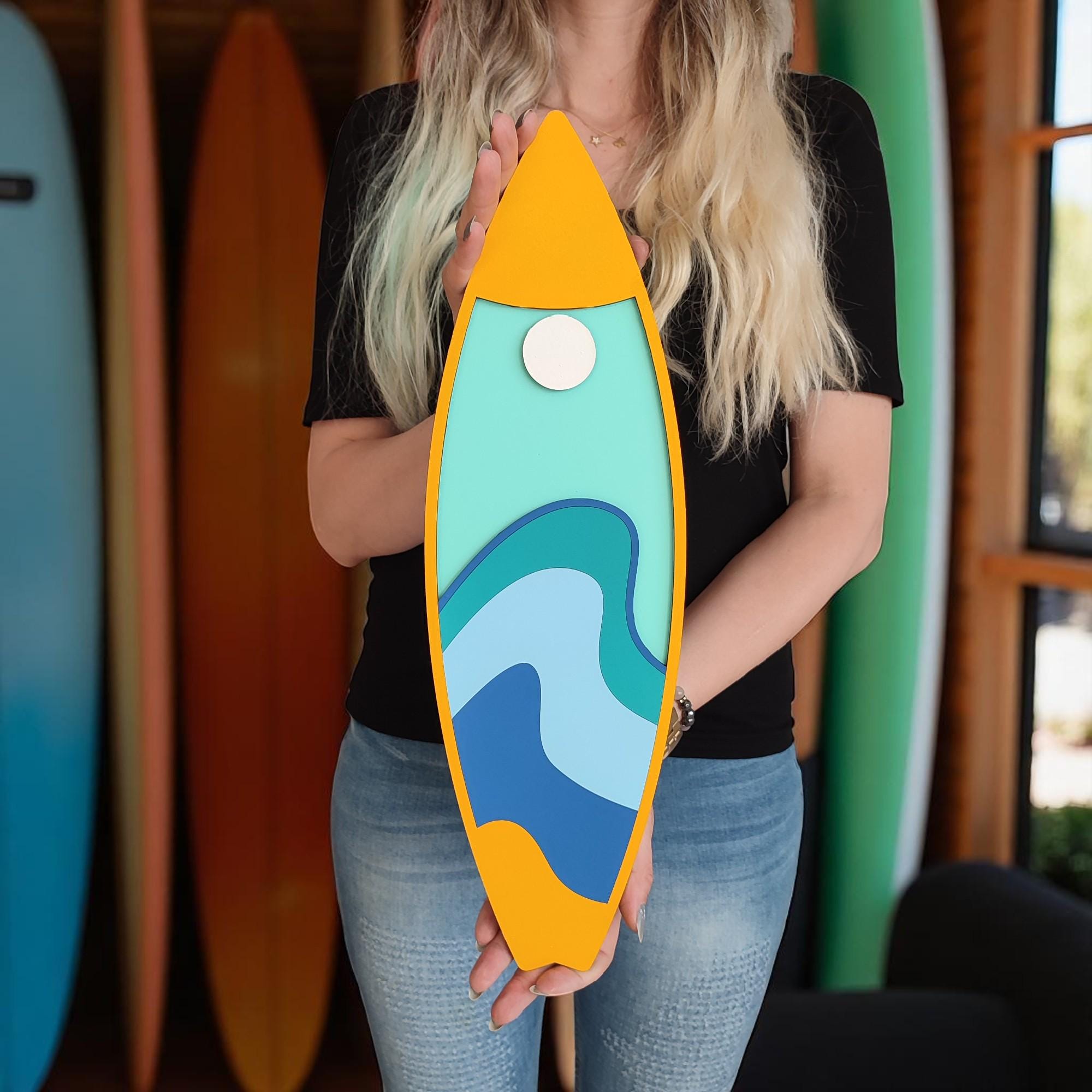 Bring the laid-back spirit of the coast right into your home with this set of 2 handcrafted wooden surfboard wall art signs. Designed to add just the right touch of beachy vibes, these signs are perfect for anyone who loves the ocean, surfing, or simply wants to create a relaxed coastal atmosphere.