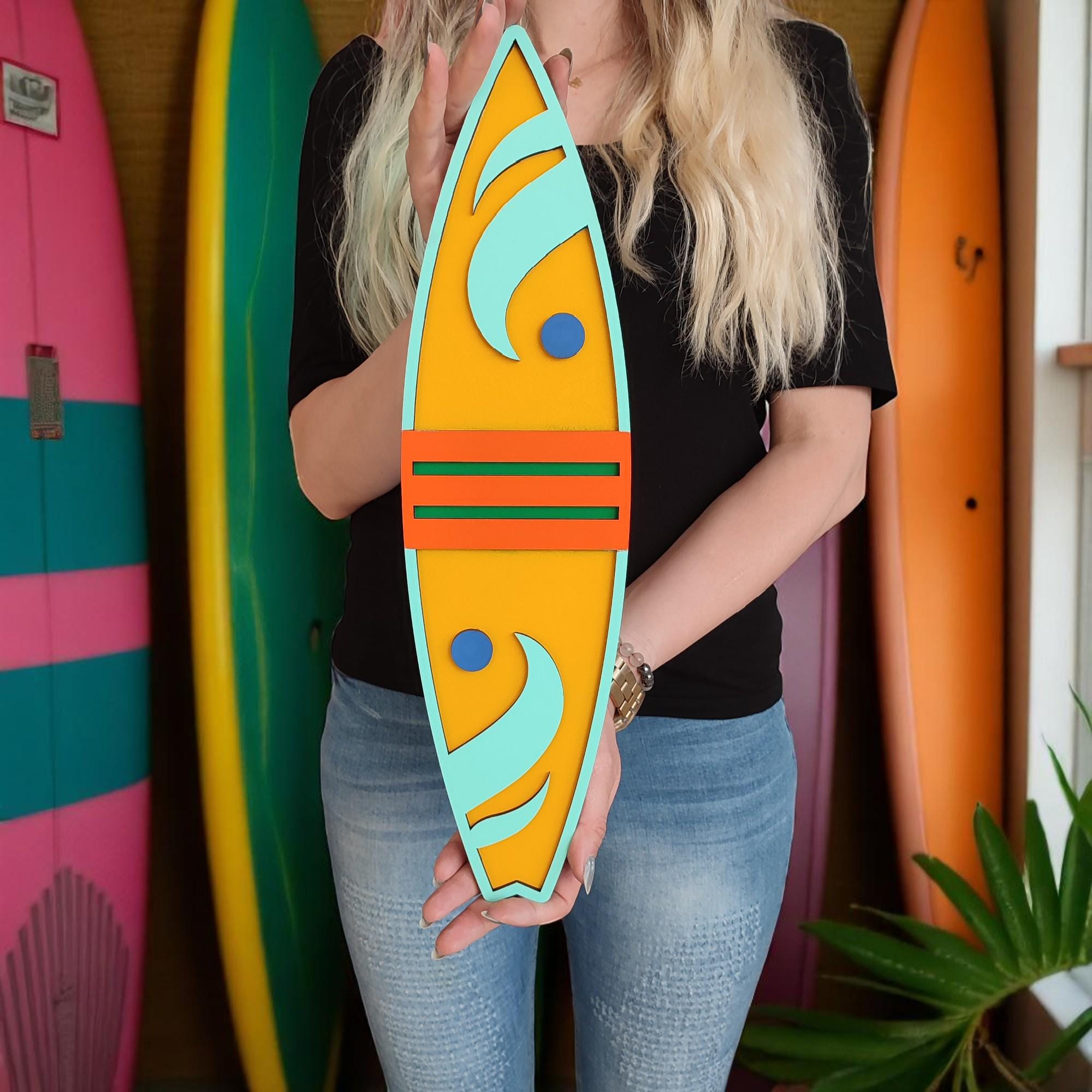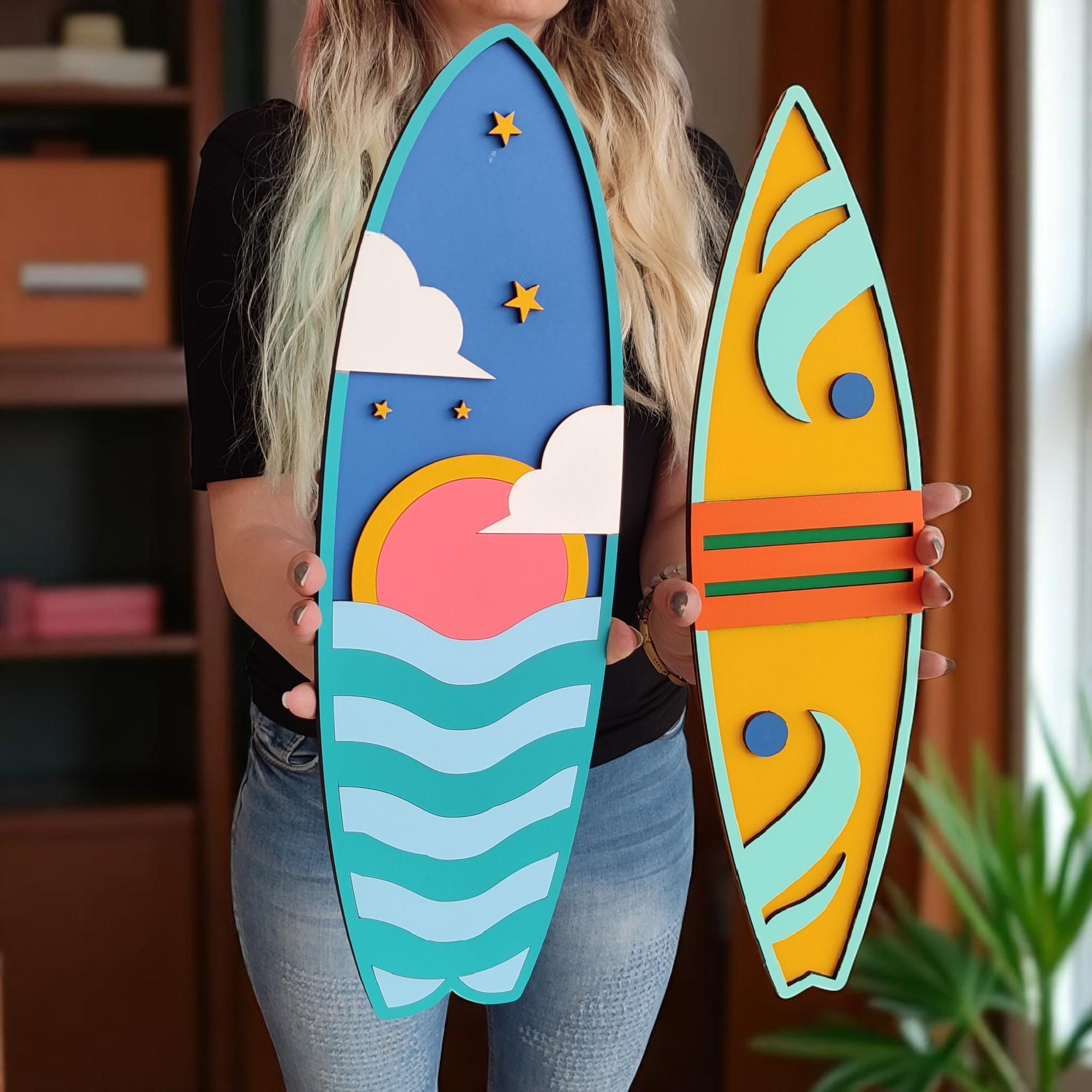 Bring the laid-back spirit of the coast right into your home with this set of 2 handcrafted wooden surfboard wall art signs. Designed to add just the right touch of beachy vibes, these signs are perfect for anyone who loves the ocean, surfing, or simply wants to create a relaxed coastal atmosphere.