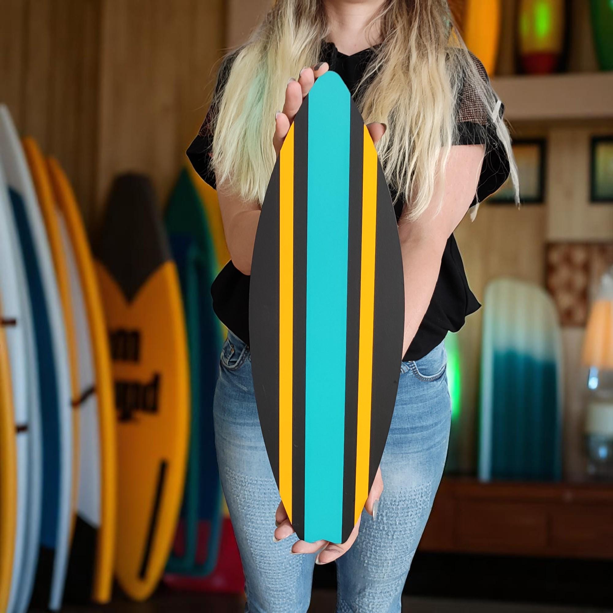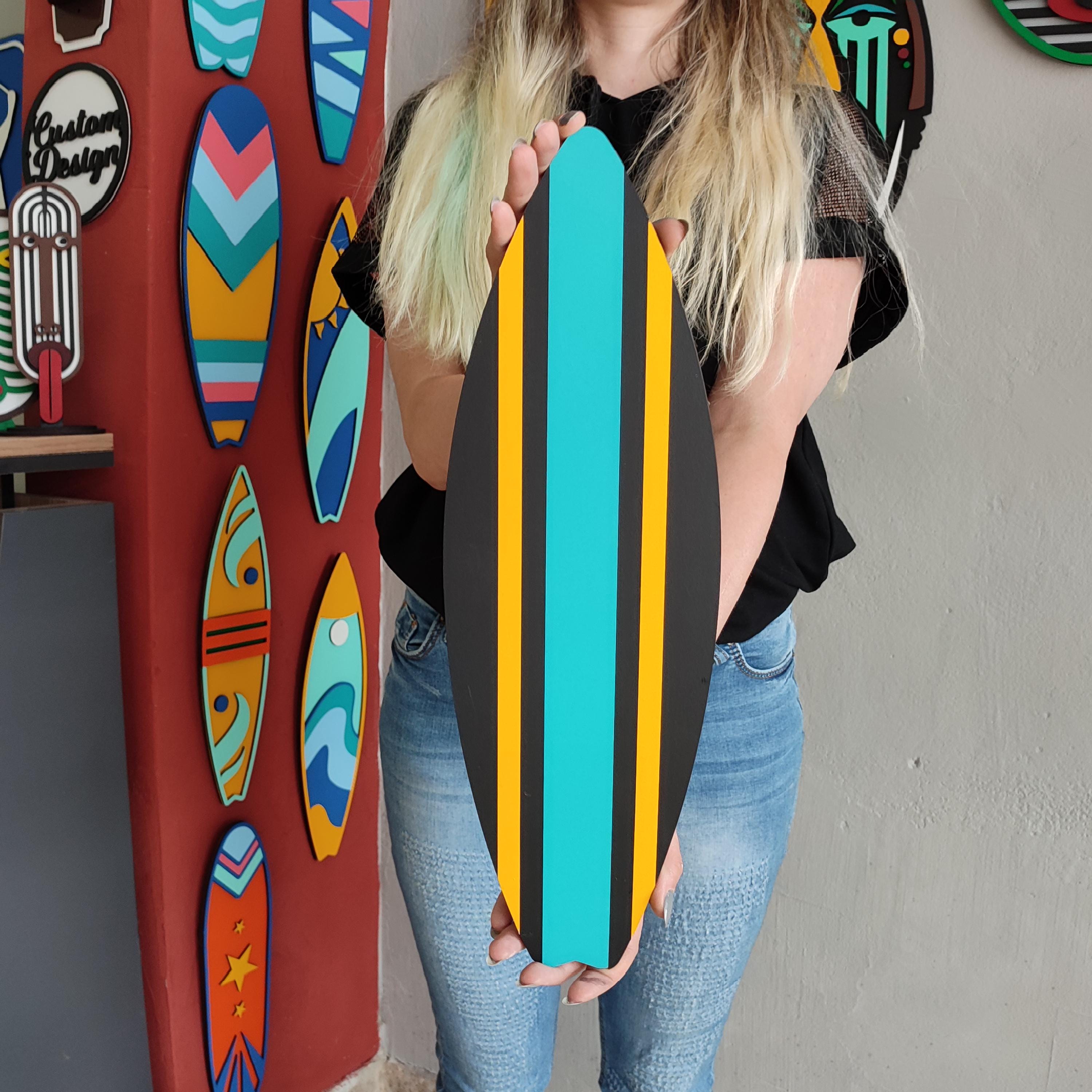 Handcrafted Surfboard Design – Carefully cut and shaped from high-quality MDF wood, then hand-painted for a bright, beach-ready finish.