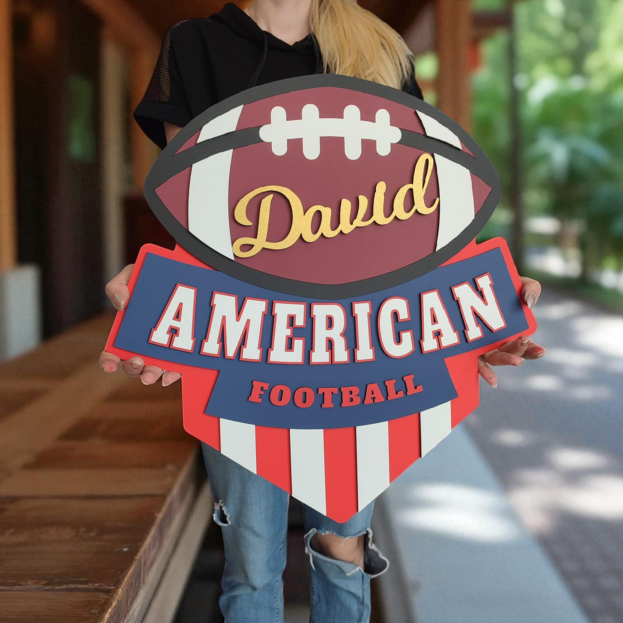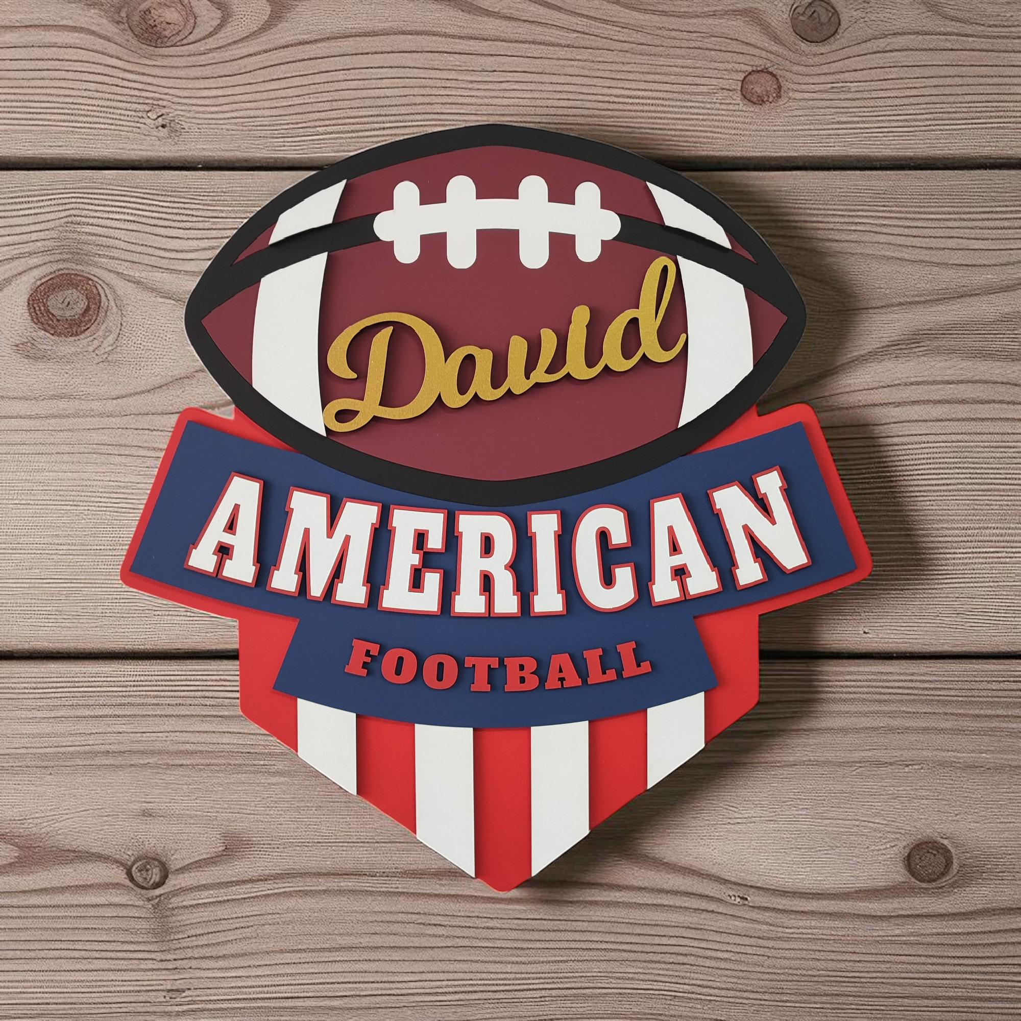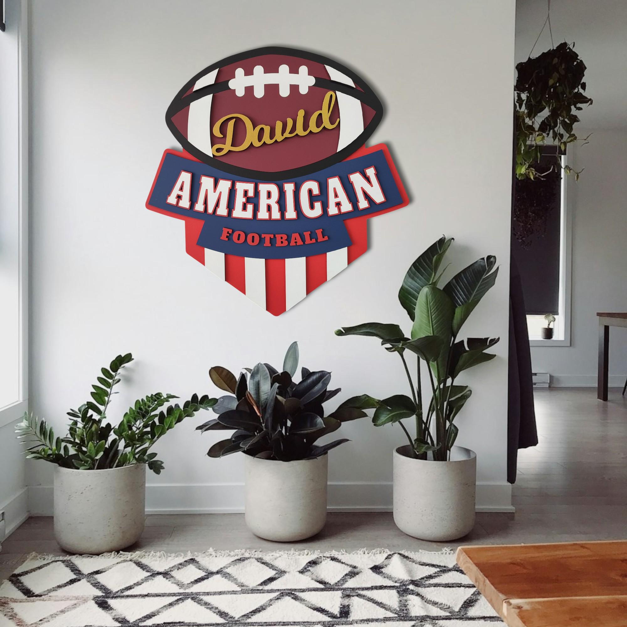 Show off your football pride with this personalized American football logo wall art, personalized just for you! Whether it's your name, your team's nickname, or a special saying, this handcrafted wooden sign is a bold way to celebrate your love of the game.