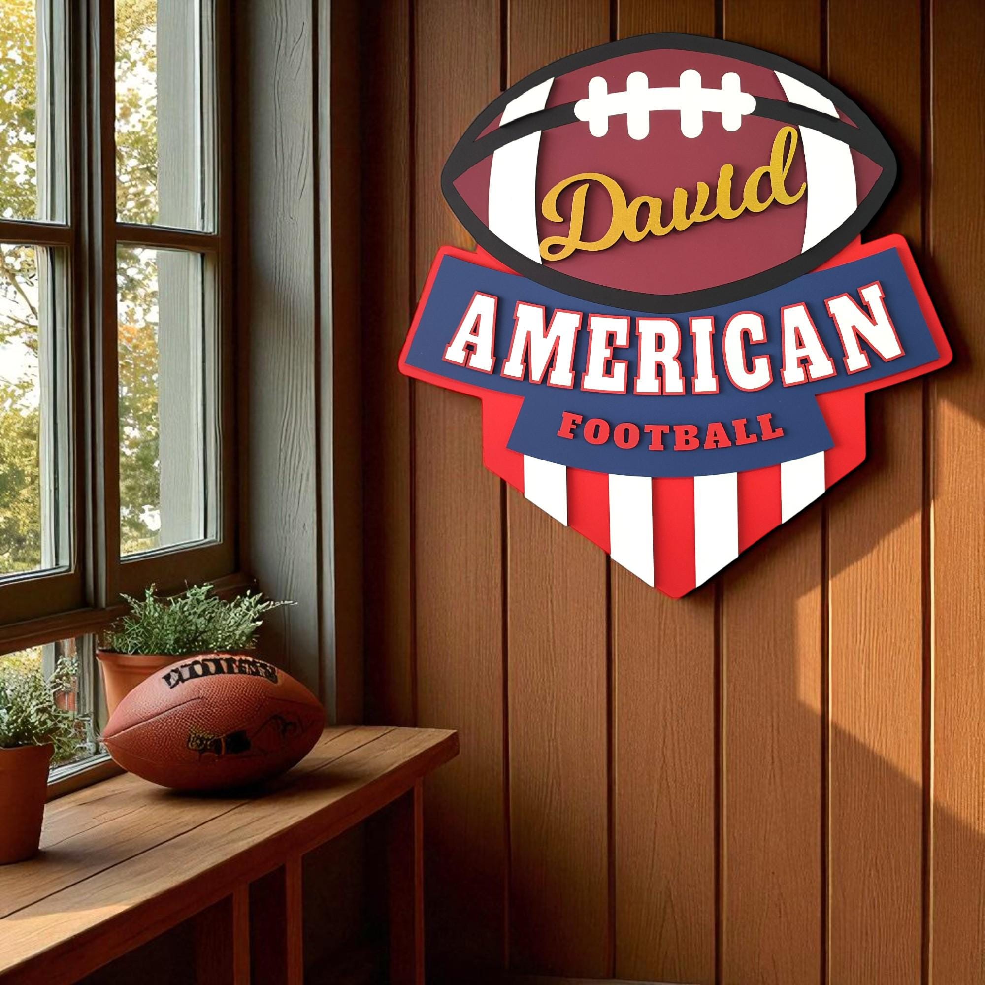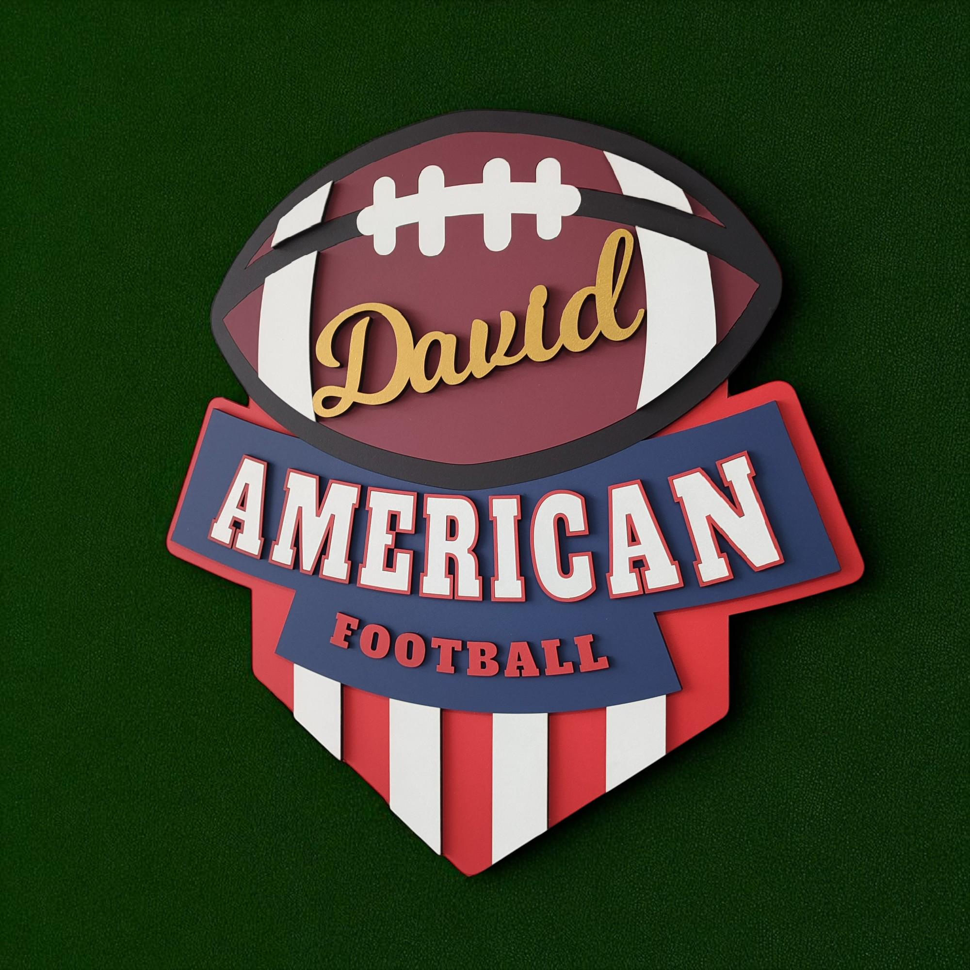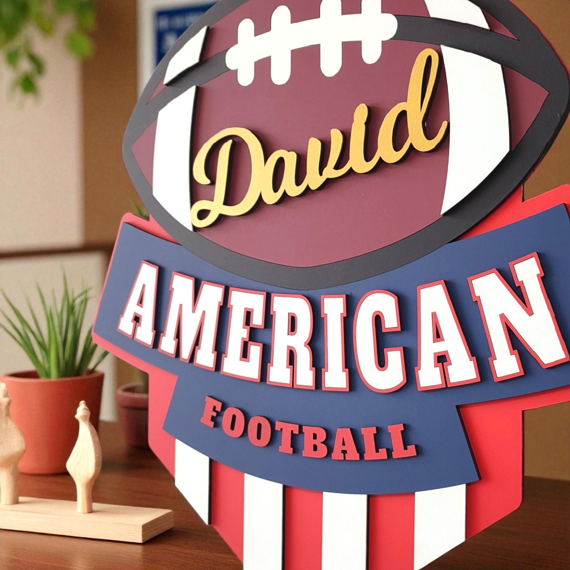 Show off your football pride with this personalized American football logo wall art, personalized just for you! Whether it's your name, your team's nickname, or a special saying, this handcrafted wooden sign is a bold way to celebrate your love of the game.