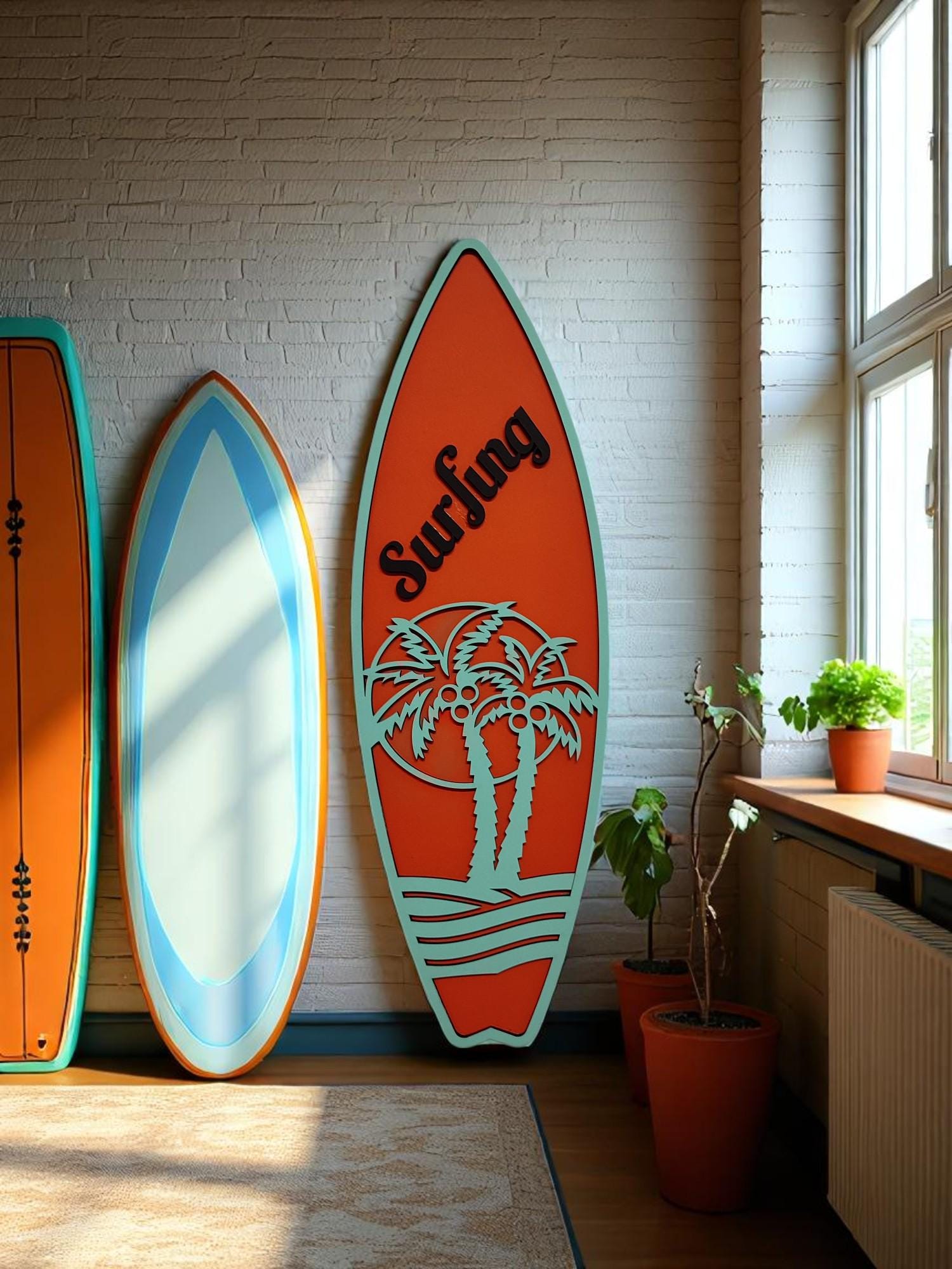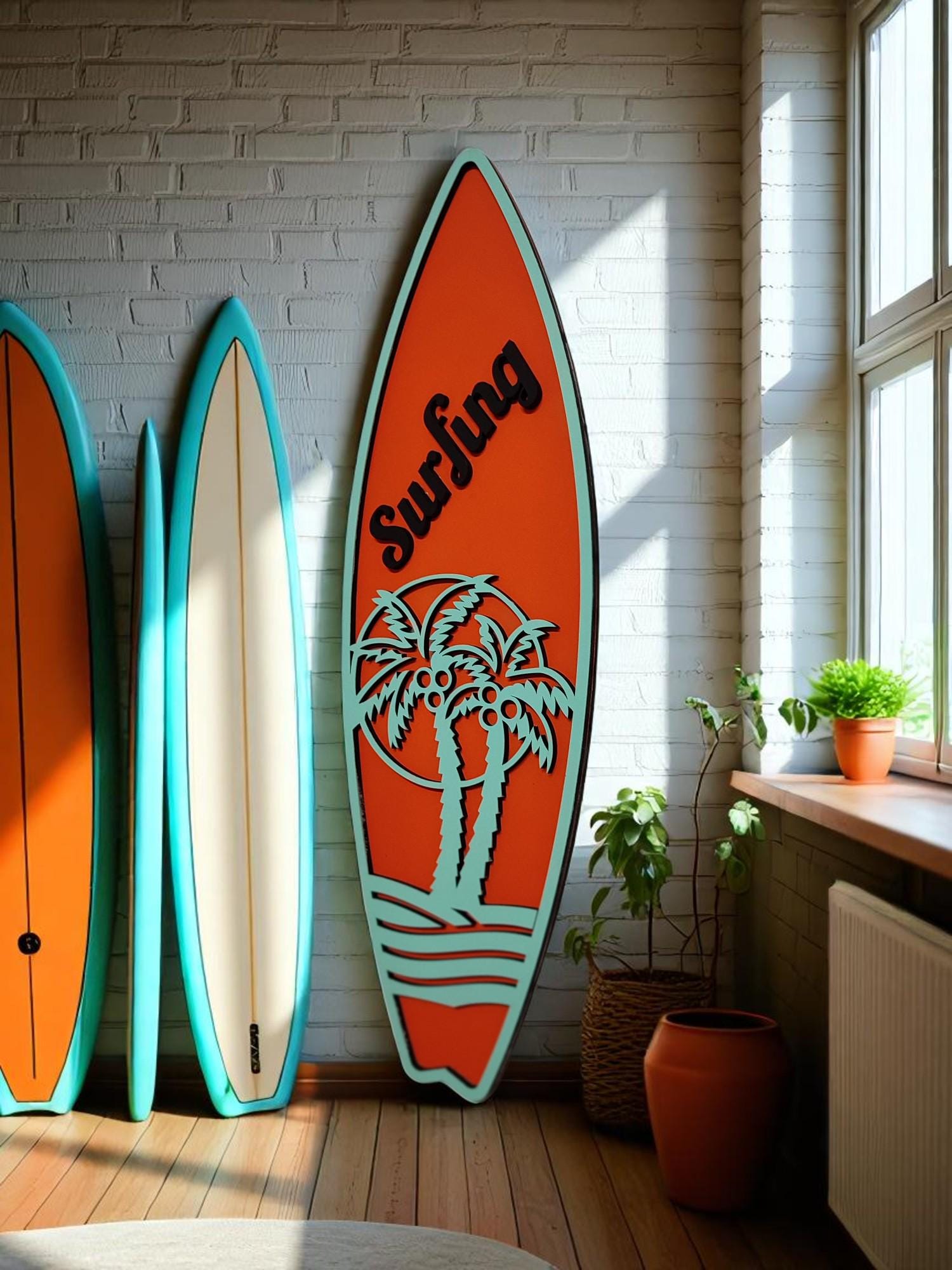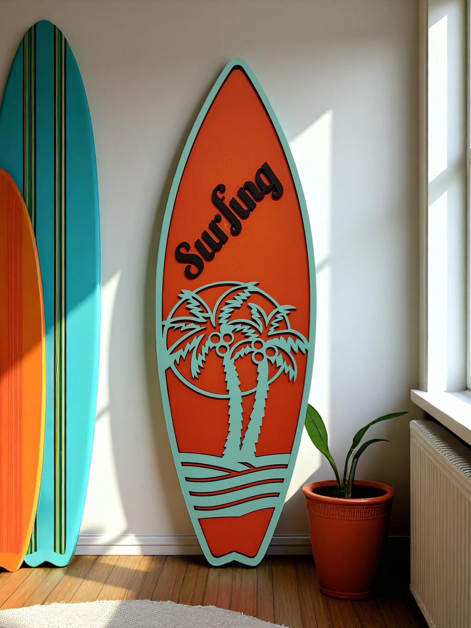 Made from durable MDF wood and carefully hand-painted with eco-friendly acrylics, each surfboard features multi-dimensional layers that create depth and texture. Whether you want to celebrate a family name, a beach house address, or a favorite surf spot, this custom wall hanging makes a standout statement.
