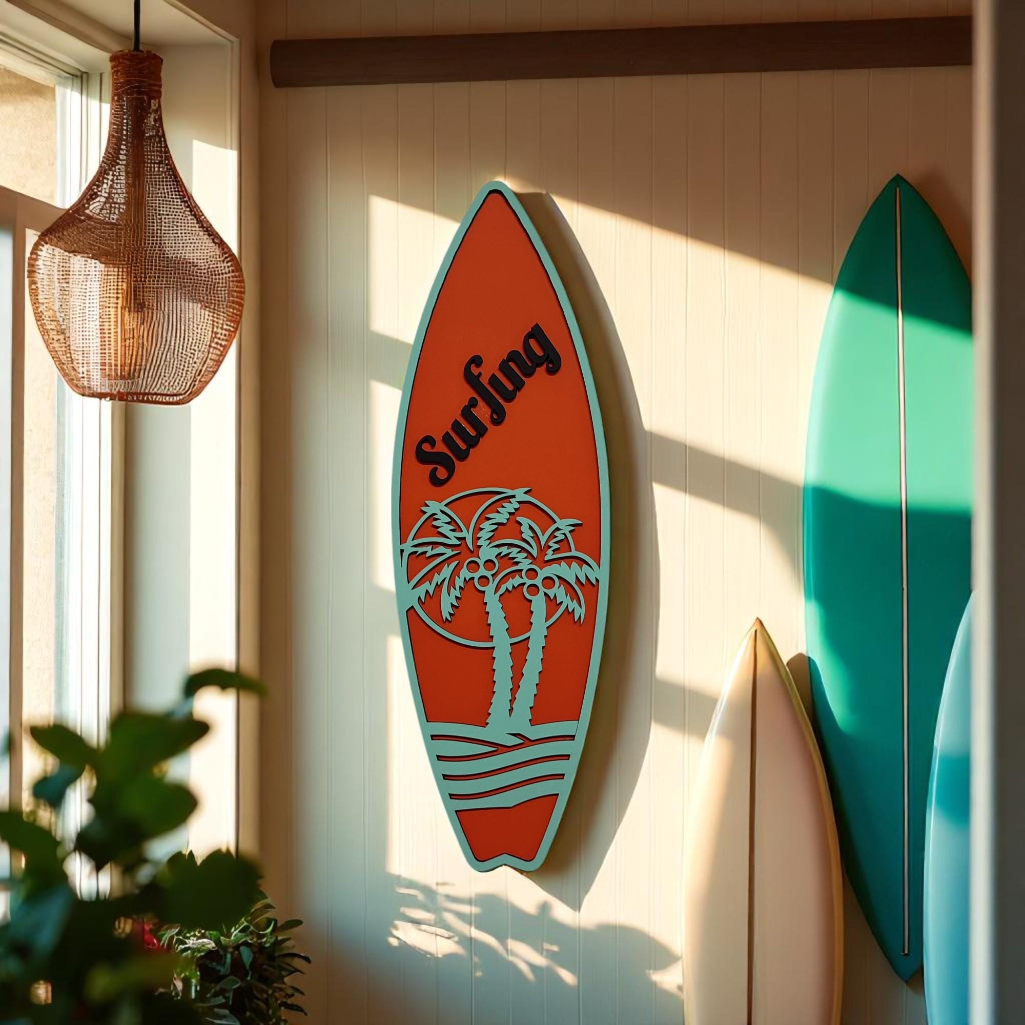 Add a personal touch to your coastal decor with this personalized layered surfboard wall art, handcrafted and hand-painted just for you. Combining layered wood design with custom colors and names, this unique piece brings beachy vibes and a special meaning to any room.