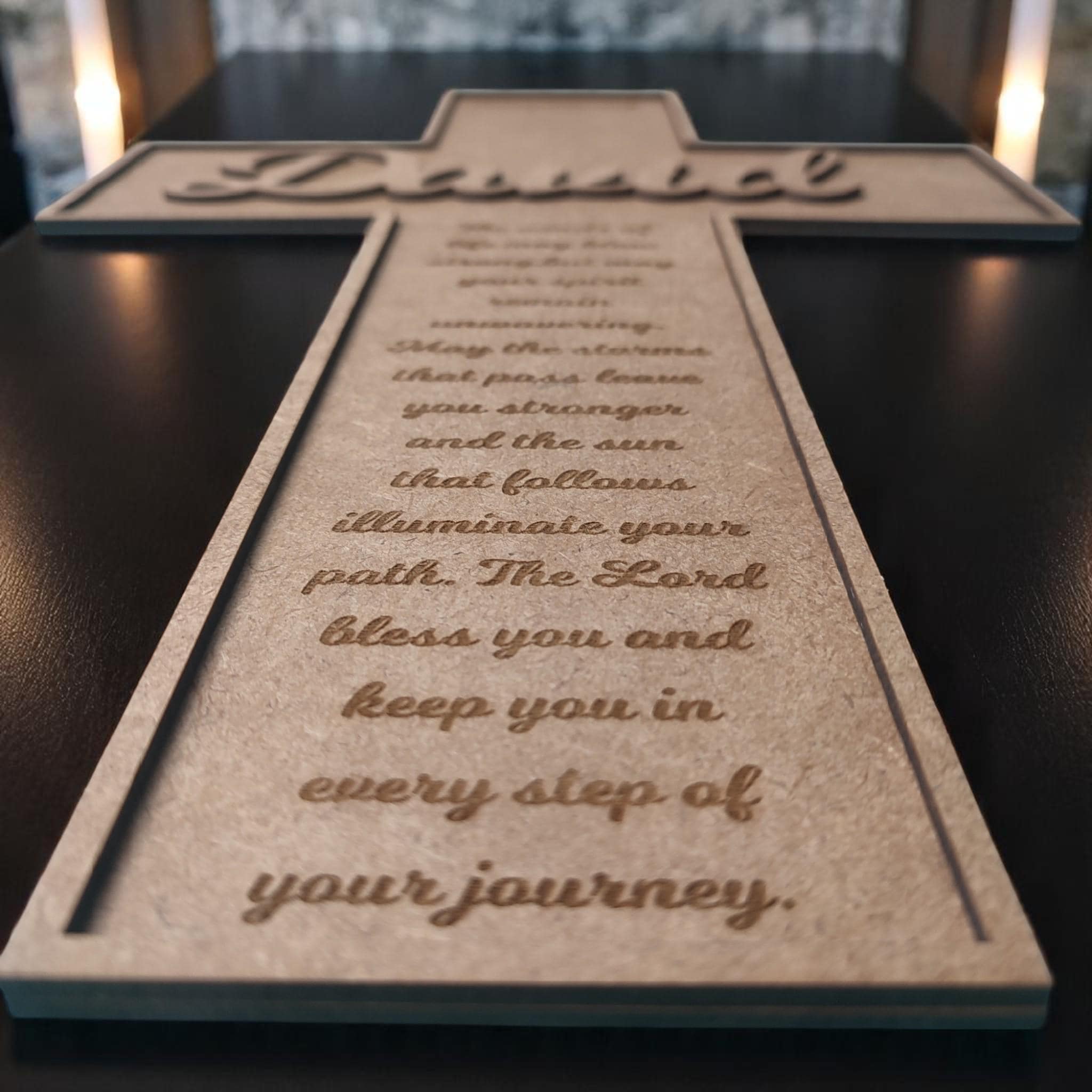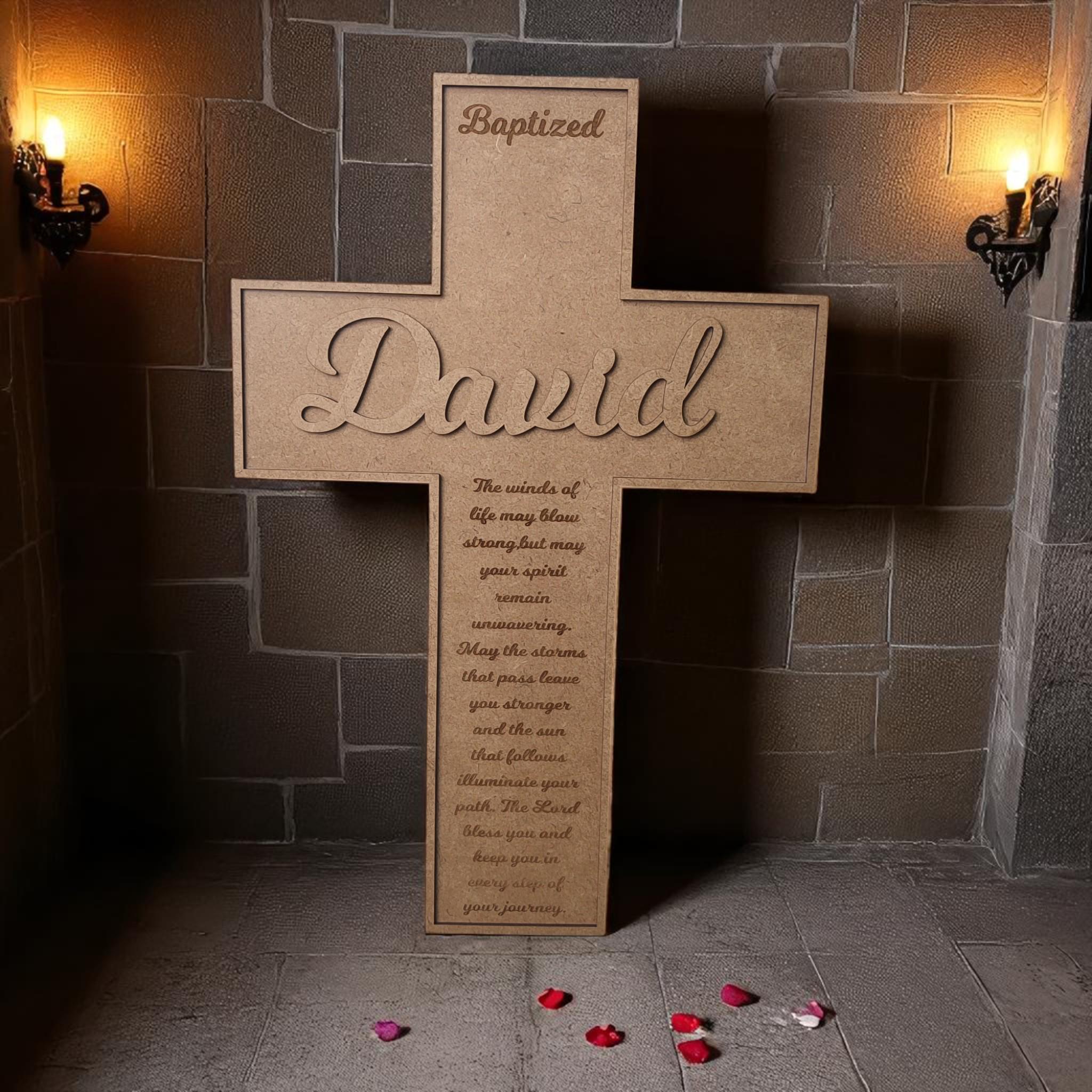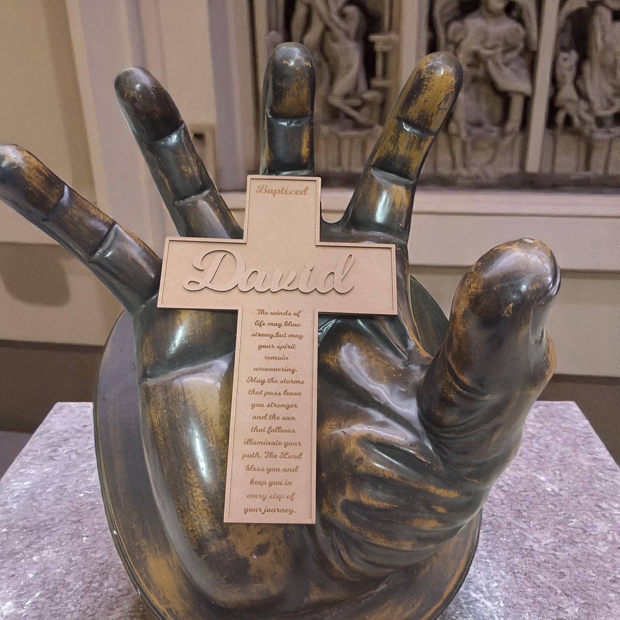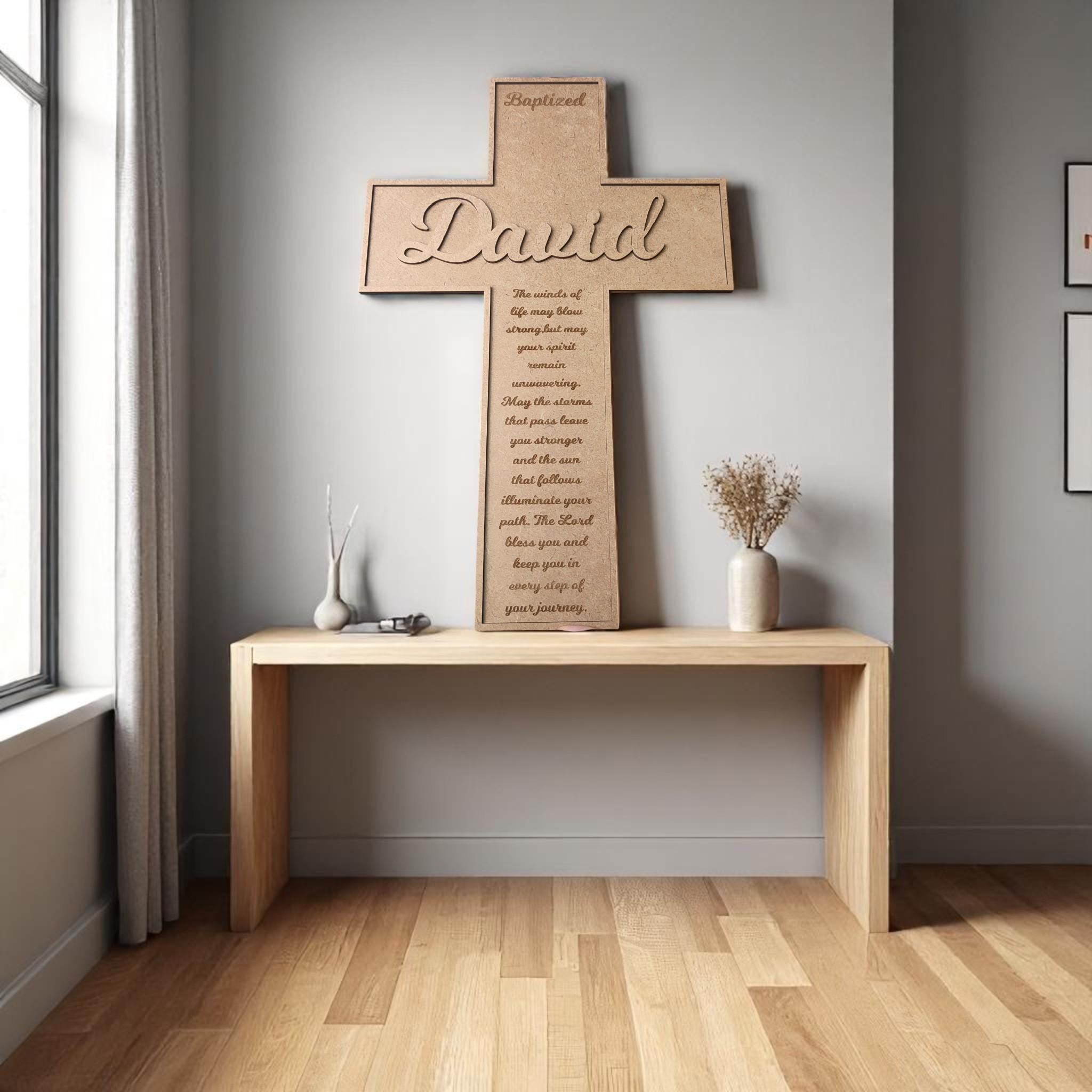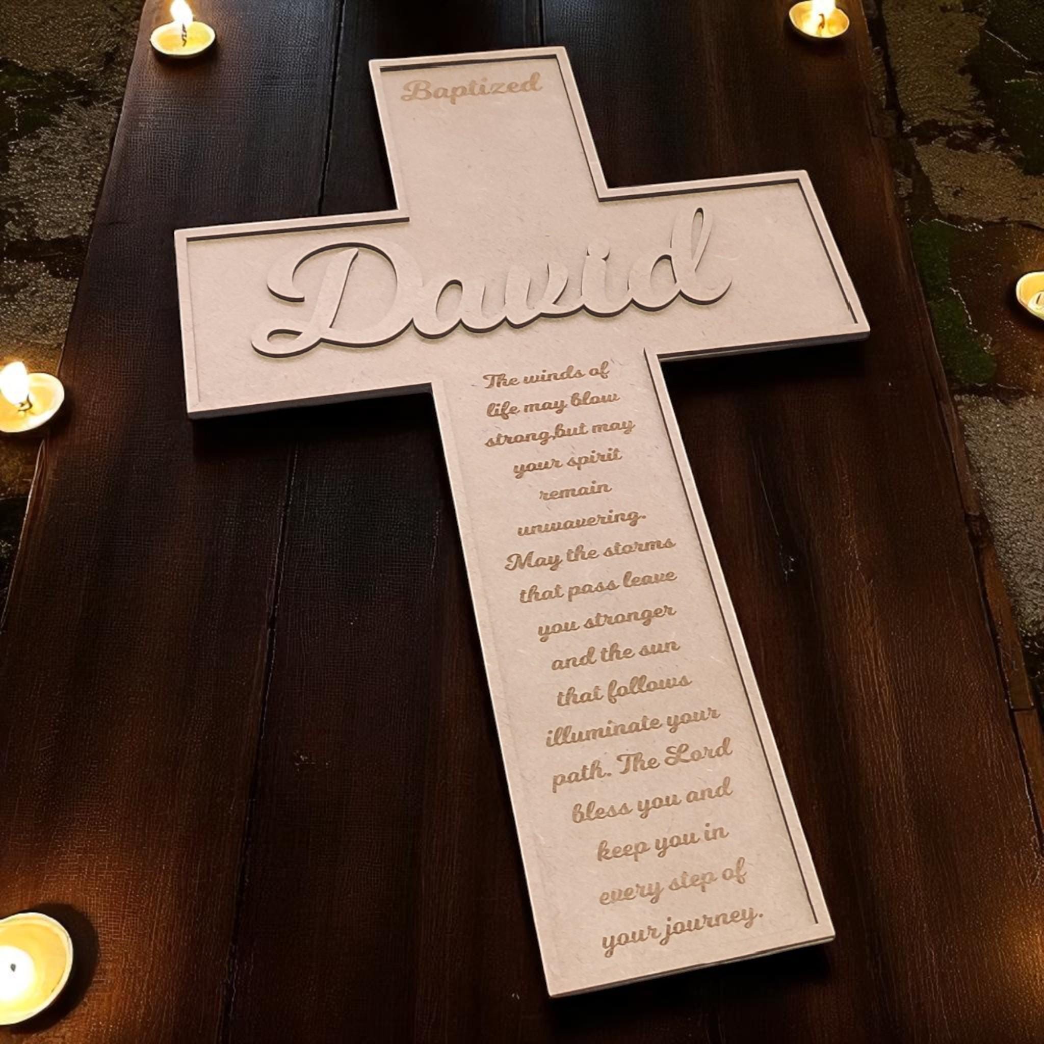 Each cross is carefully laser-cut from durable MDF wood and hand-painted with care. You can personalize it with a name, date, Bible verse, or a short message — making it a one-of-a-kind keepsake for baptisms, confirmations, weddings, memorials, or housewarmings.