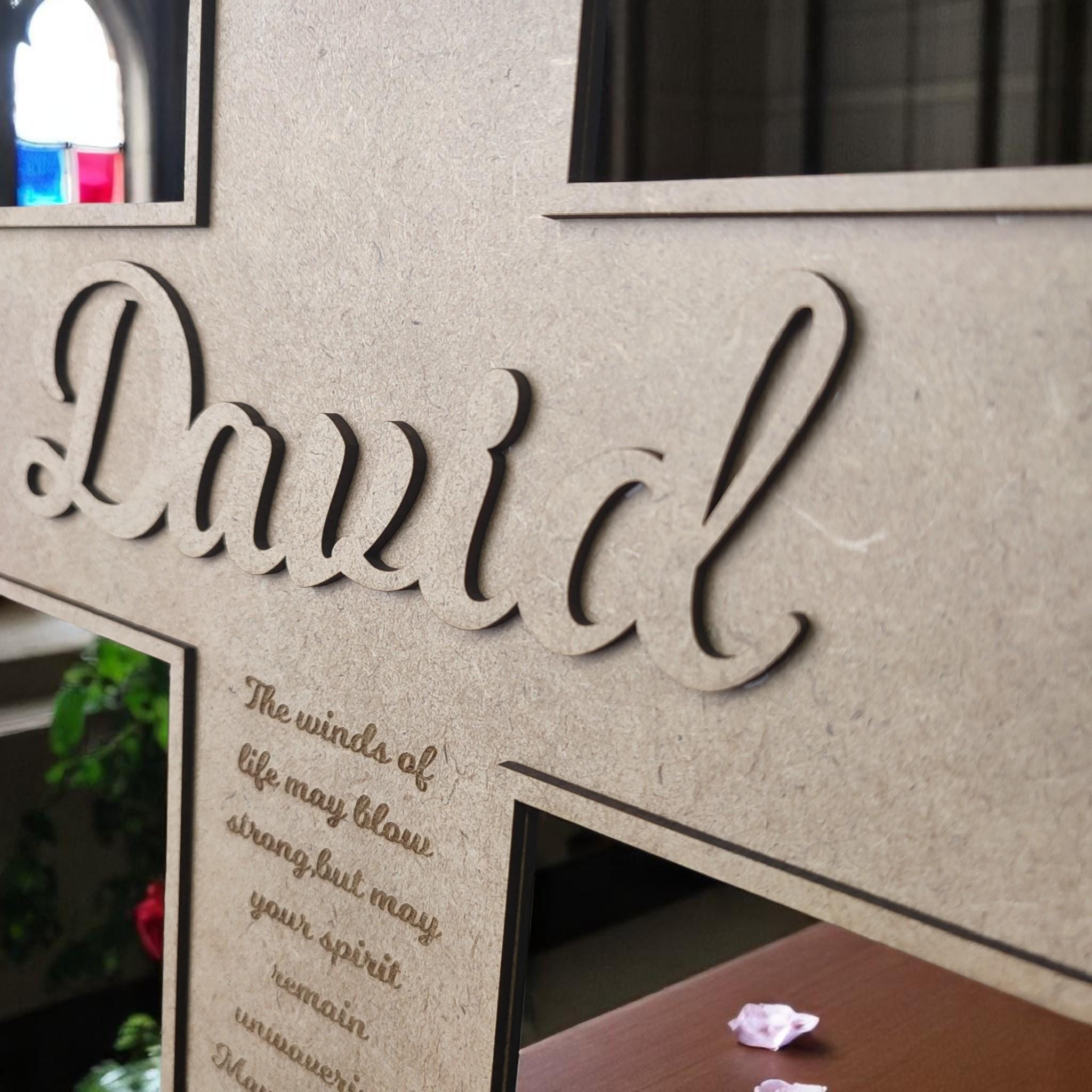 Customizable wooden wall cross — add a name, date, verse, or message